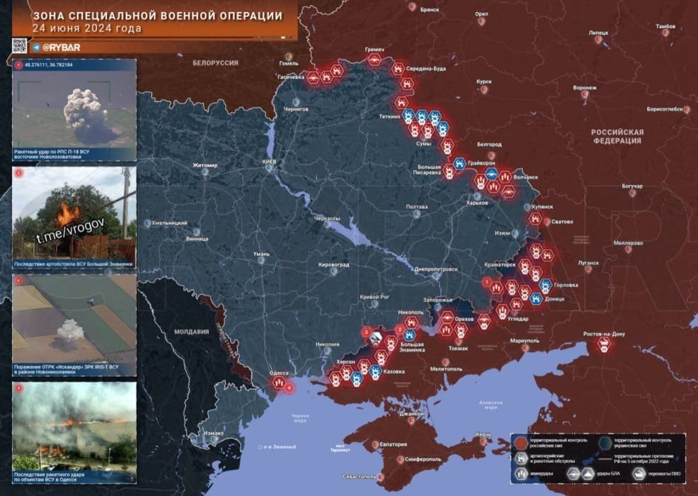 Сводки с различных направлений в зоне СВО, а также карты боевых действий на Украине на вторник, 25 июня 2024 года. В зоне военной спецоперации происходит множество событий, львиная доля которых связана с активным продвижением российских войск.