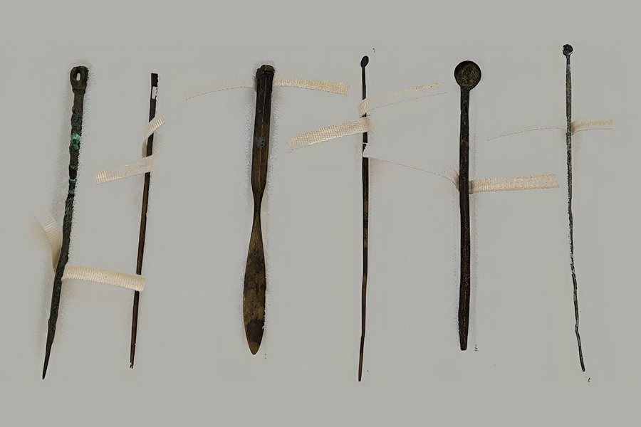 Используя компьютерный томограф, способный заглядывать под поверхность объектов, исследователи изучили шесть инструментов, включая бронзовую ручку скальпеля, которая использовалась в хирургии.