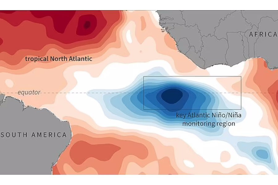Обычно в центральной экваториальной Атлантике температура воды в марте и апреле достигает пиковых значений, а затем начинает понижаться летом. Однако в этом году, начиная с июня, температура упала на 0,5–1,0°C (0,9–1,8°F) ниже нормы для этого времени года, и темпы охлаждения оказались беспрецедентными.