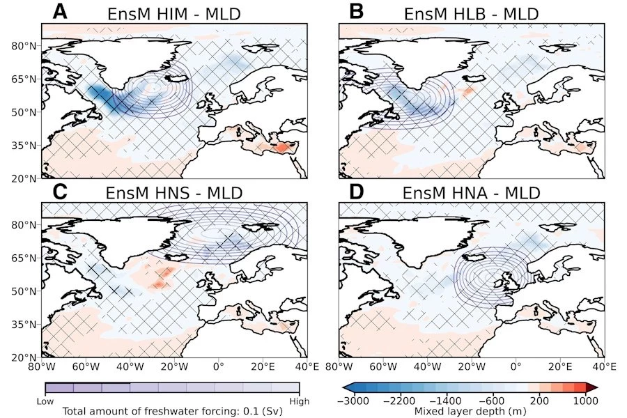С помощью климатической модели Института Альфреда Вегенера ученые оценили влияние различных источников пресной воды на AMOC. Особое внимание уделили бассейну моря Ирмингера — региону в северной части Атлантики, где течение совершает разворот. Оказалось, что именно пресная вода из тающих ледников Гренландии оказывает наибольшее влияние. Вода остается на поверхности, охлаждая и ослабляя течение. В результате движение теплой воды на север замедляется, а восстановление циркуляции в тропических широтах оказывается невозможным.