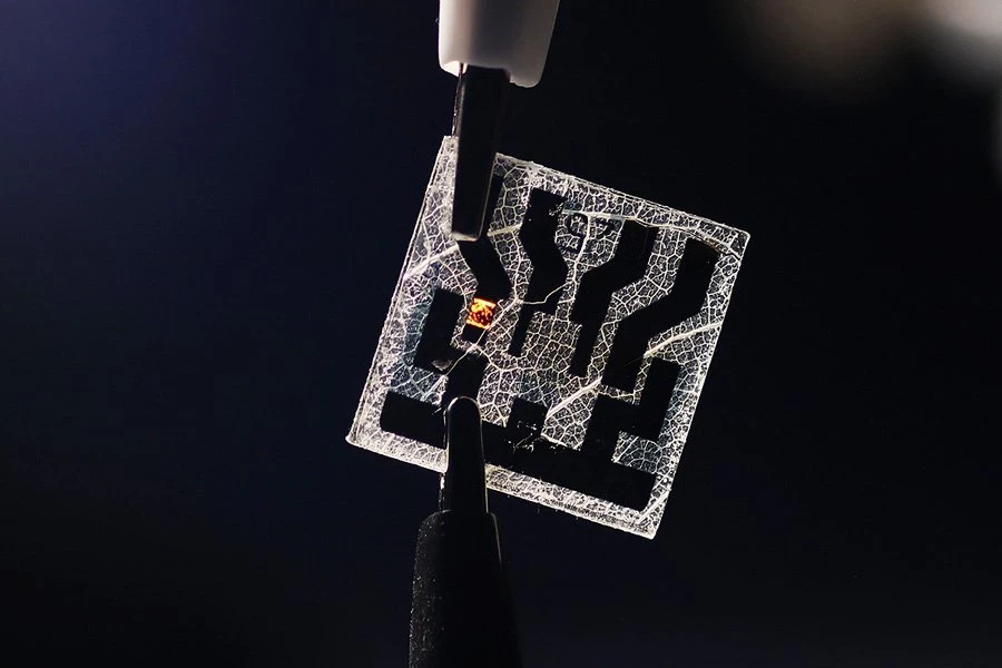 Биоразлагаемые, но достаточно прочные, чтобы выдерживать ураганы, листья черпают свою силу из своего «скелета» — сильно разветвленной сети тонких жилок из древесного соединения, называемого лигноцеллюлозой. Чтобы превратить лист магнолии в материал для печатной платы, Наир сначала разобрал его до скелета, химически удалив клетки листа. Затем он заполнил отверстия скелета этилцеллюлозой, прочным биоразлагаемым полимером. Полученная гибкая плата выдерживала все виды процессов производства электроники, включая резку форм на платах лазерами, печать схем поверх них с помощью коммерческих серебряных чернил и пайку компонентов на них.