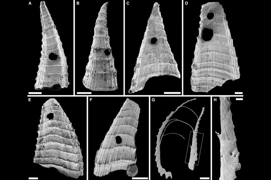 Теперь Бикнелл и его коллеги, похоже, обнаружили доказательства в виде отверстий, пробитых в раковинах Lapworthella fasciculata, крошечного животного, отдаленно связанного с современными двустворчатыми моллюсками-брахиоподами.