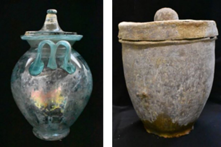 Там они нашли ряд роскошного погребального инвентаря – духи пачули, драгоценности и украшения, ткани, стеклянные предметы и большой свинцовый контейнер. Когда исследователи открыли контейнер, они обнаружили запечатанную стеклянную урну, наполовину наполненную какой-то жидкостью.