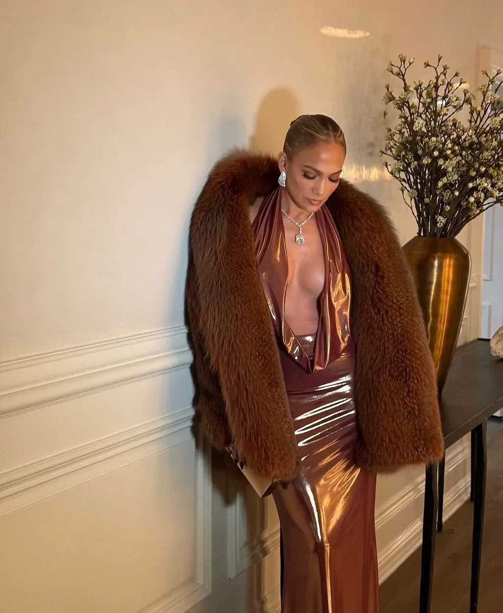 На мероприятие актриса и певица пришла в платье в пол шоколадного цвета с открытой спиной и глубоким декольте. Также образ звезды добавляли шубка в тон, которую Лопес периодически снимала, структурный клатч и бриллиантовые украшения.