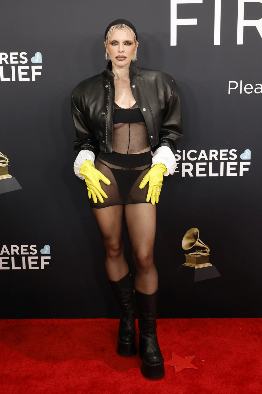 34-летняя модель вышла в свет в чёрном полупрозрачном мини-платье с полосами и стрингах, поверх которого накинула чёрную косуху с объёмными плечами. Дополняли образ длинные ярко-жёлтые латексные перчатки и массивные сапоги на платформе. От образа Бьянки этот отличало лишь то, что под прозрачным "платьем" у Джулии Фокс было надето нижнее бельё.