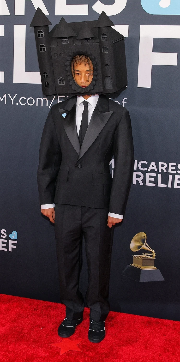 Если дочь Уилла Смита Уиллоу попала в подборку самых раздетых звезд, то сын актера Джейден точно претендует на звание обладателя самого оригинального (или дурацкого) костюма. 26-летний рэпер надел черный брючный костюм, а на голову водрузил… игрушечный замок. Выглядел Джейден, мягко говоря, странно.