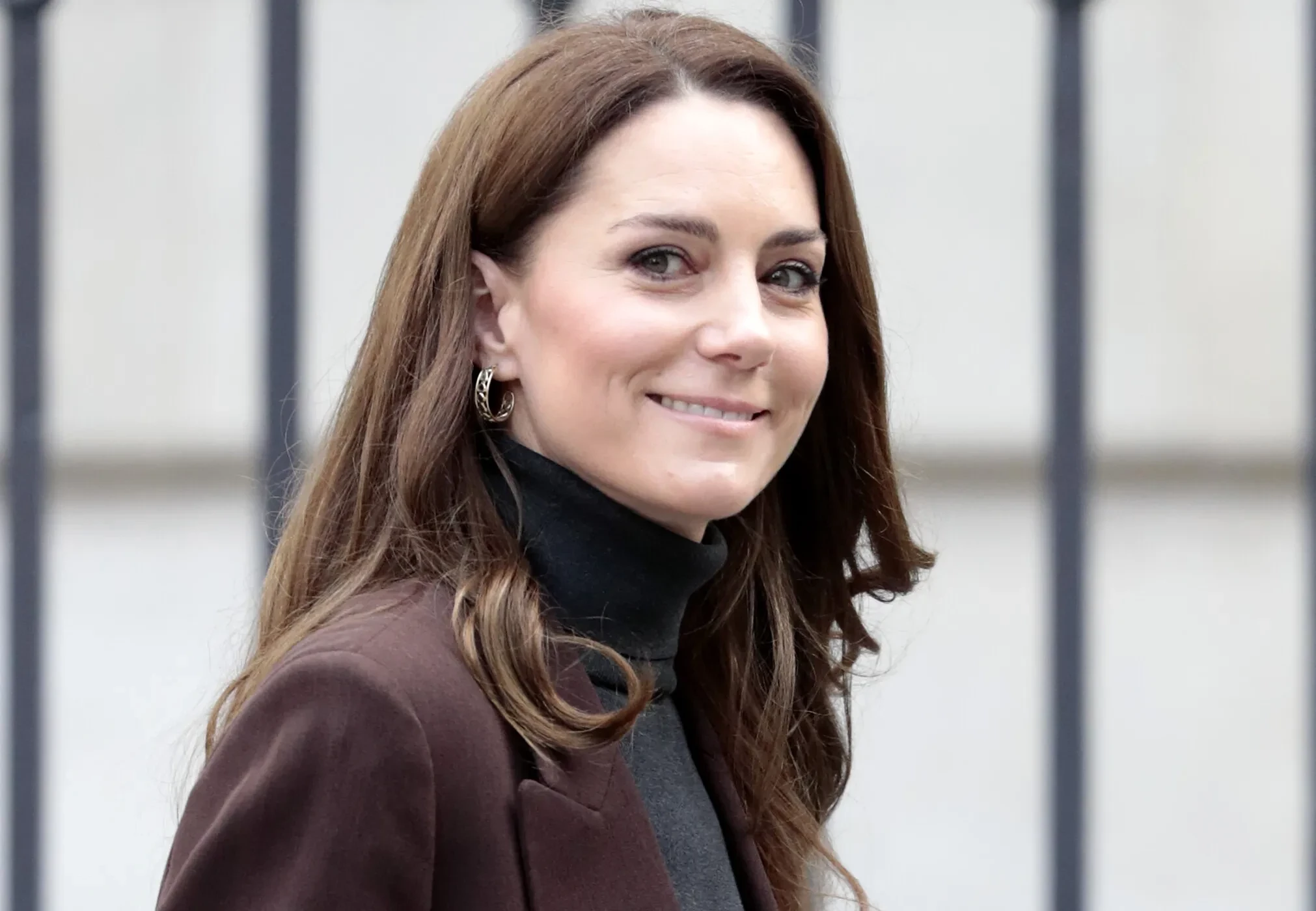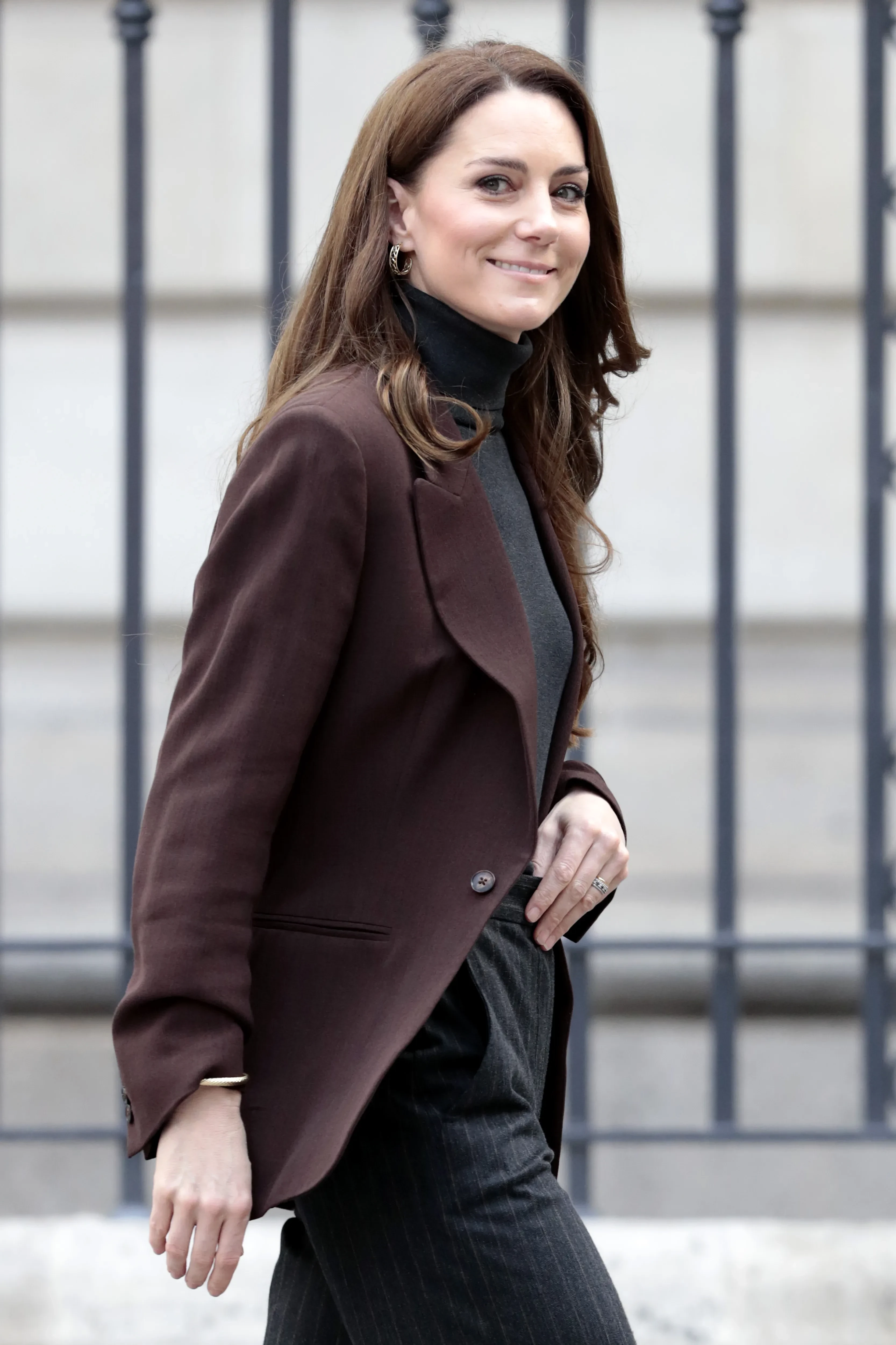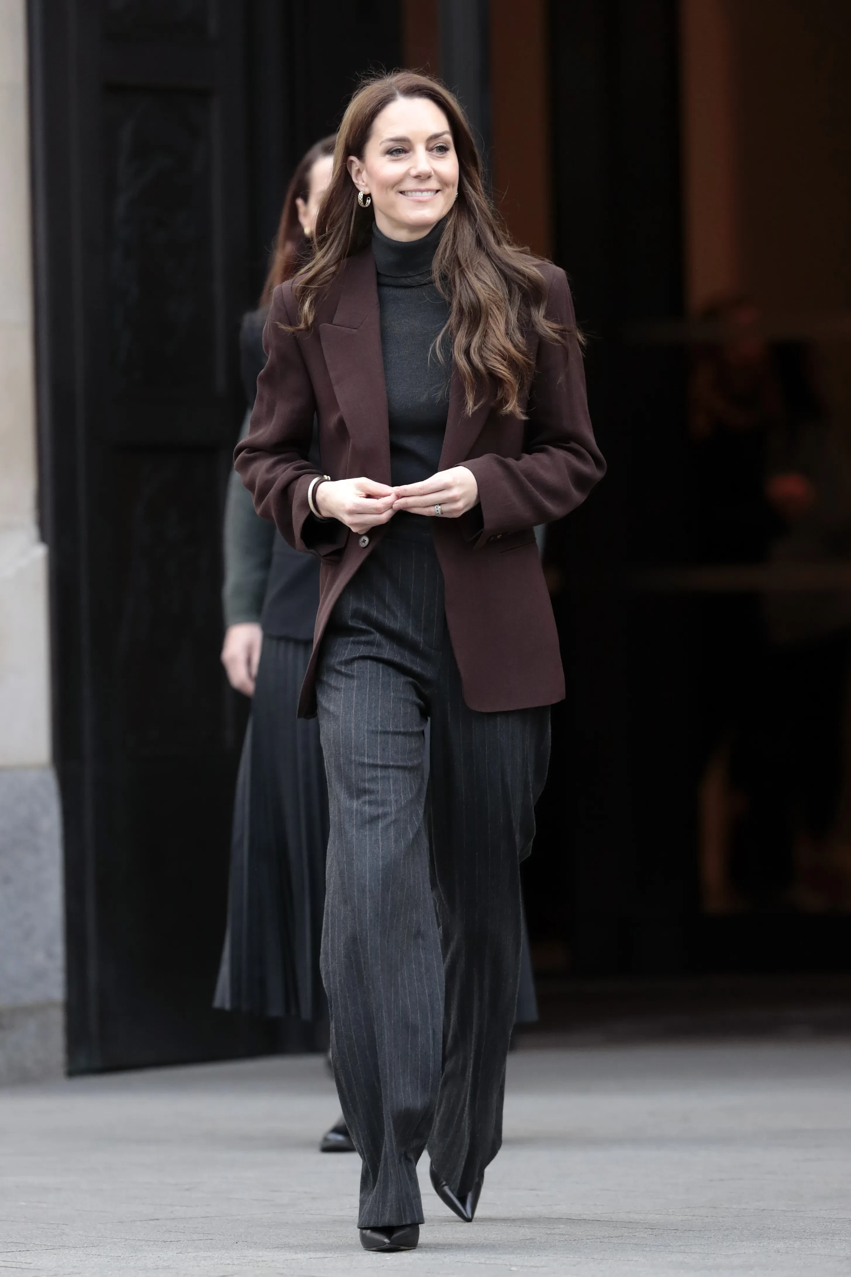 Для посещения галереи принцесса Уэльская, которая всё чаще появляется на публике, выбрала коричневый пиджак, чёрный шерстяной джемпер с высоким воротом, а также брюки Jigsaw в полоску. Она дополнила образ серьгами Sézane Bruna и золотым браслетом.