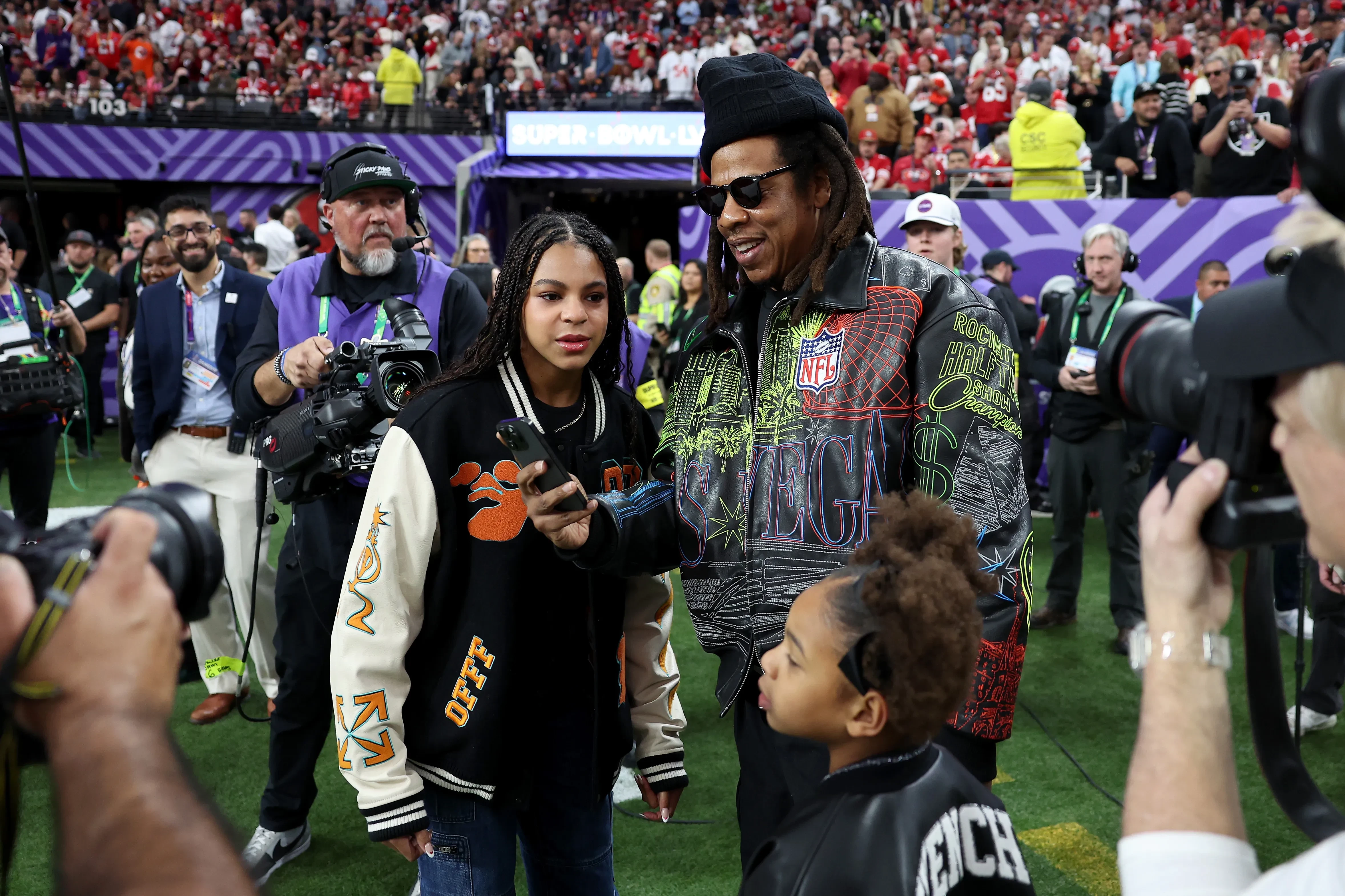 Джей-Зи, Блу Айви и Руми Картер/Фото: Ezra Shaw/Getty ImagesОднако Бейонсе — не единственная, кого "потеряли" во время Суперкубка. На матч пришёл нынешний президент США Дональд Трамп, однако без своей жены и первой леди Мелании. Компанию ему составила дочь Иванка. Она появилась в белоснежных брюках и жилете, подчеркнув талию широким коричневым ремнём. Её образ сразу получил звание самого стильного на мероприятии.