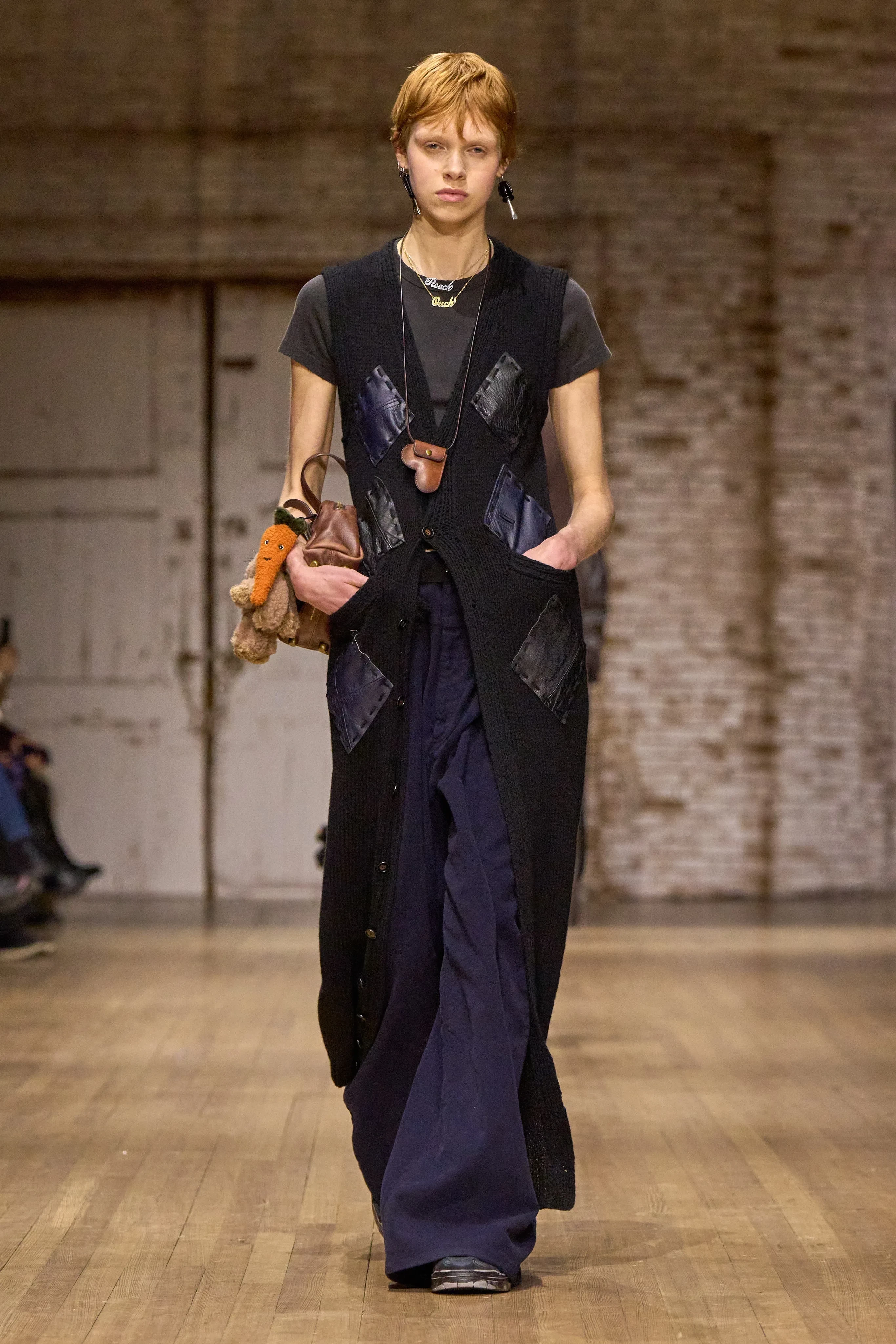 Эмили Ратаковски/Фото: Dimitrios Kambouris/Getty ImagesЭмили Ратаковски/Фото: emrata/Instagram*Холли Бейли/Фото: Dimitrios Kambouris/Getty ImagesЛеннон Галлахер/Фото: Dimitrios Kambouris/Getty ImagesЛеннон Галлахер/Фото: Dimitrios Kambouris/Getty ImagesНа подиуме преобладали вещи в уличном стиле расслабленного силуэта с отсылками к нулевым и детству: широкие брюки на низкой талии с тонкими ремнями, короткие косухи, длинные дублёнки, яркие очки в пластиковых оправах, плюшевая обувь, "разрисованные" футболки, жилетки с "заплатками", леопардовые шубы, сумки-медальоны и брелоки в виде игрушек. В прошлом году бренд оказался в списке самых успешных в рейтинге Lyst и стремительно набирает популярность среди зумеров.