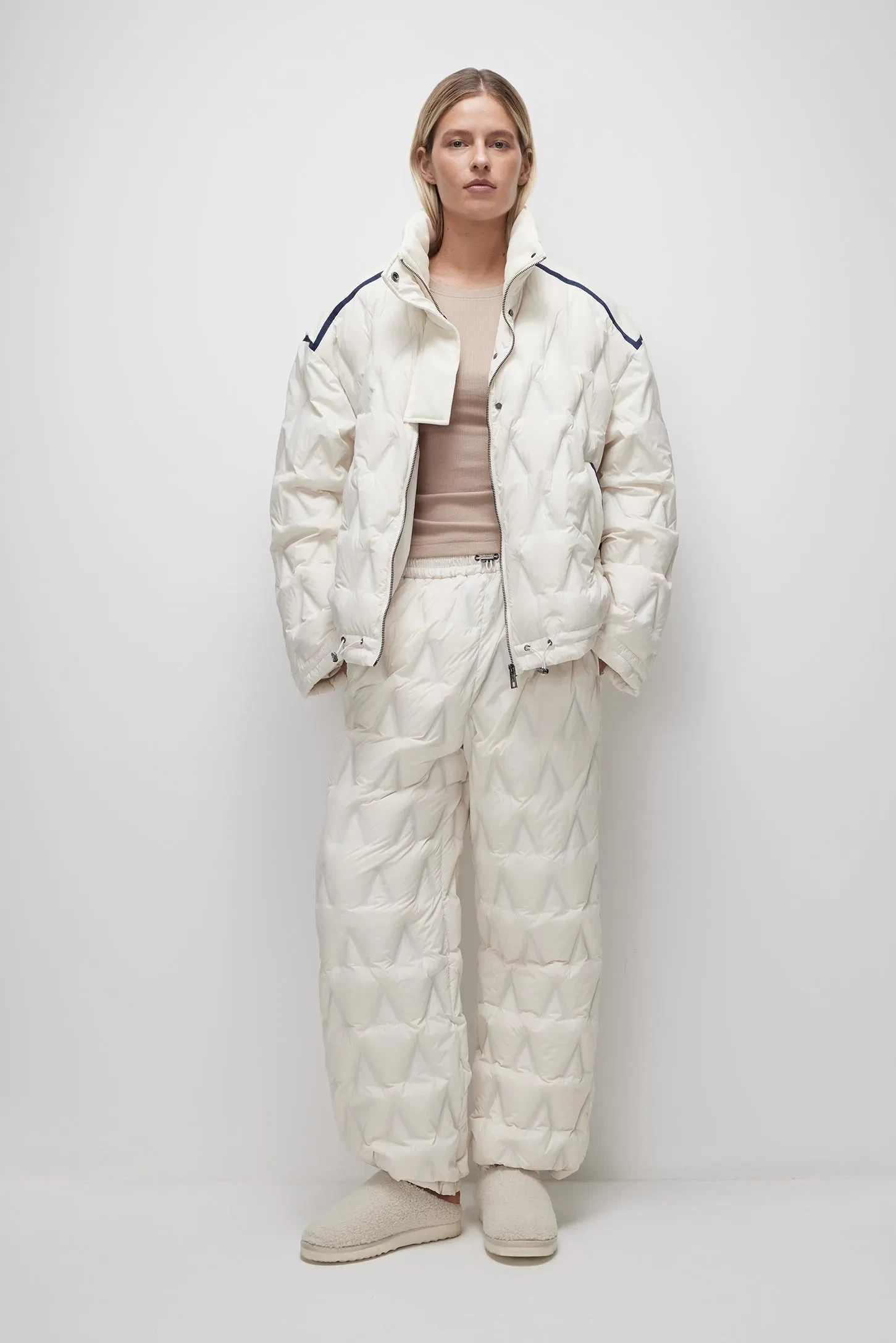 К верхней одежде в стиле Apres ski можно отнести короткие пуховики, приталенные стёганые куртки и даже шубы, в которых сегодня вполне можно встретить девушек на склоне. Конечно, меховые изделия больше подходят для посиделок на склоне с бокалом шампанского или вечеринки и отлично стилизуются с масками и лыжными ботинками.