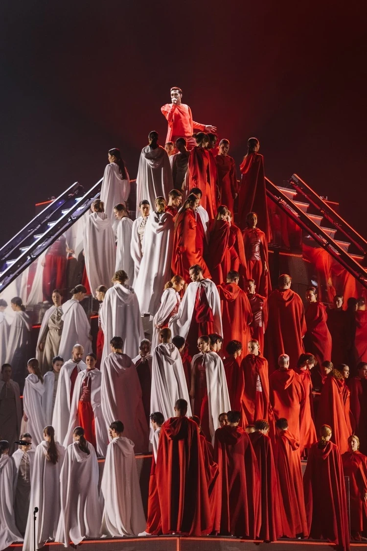 Этот исповедальный номер Билана вызвал лавину оваций. Вот он стоит в красной мантии, как и всякий талантливый человек, как яркий маркер для «быка» (хейтеров и злопыхателей, куда без них), вокруг него кружит стая мимов. Как в такой кутерьме сохранить себя? Извечный вопрос для любого художника.