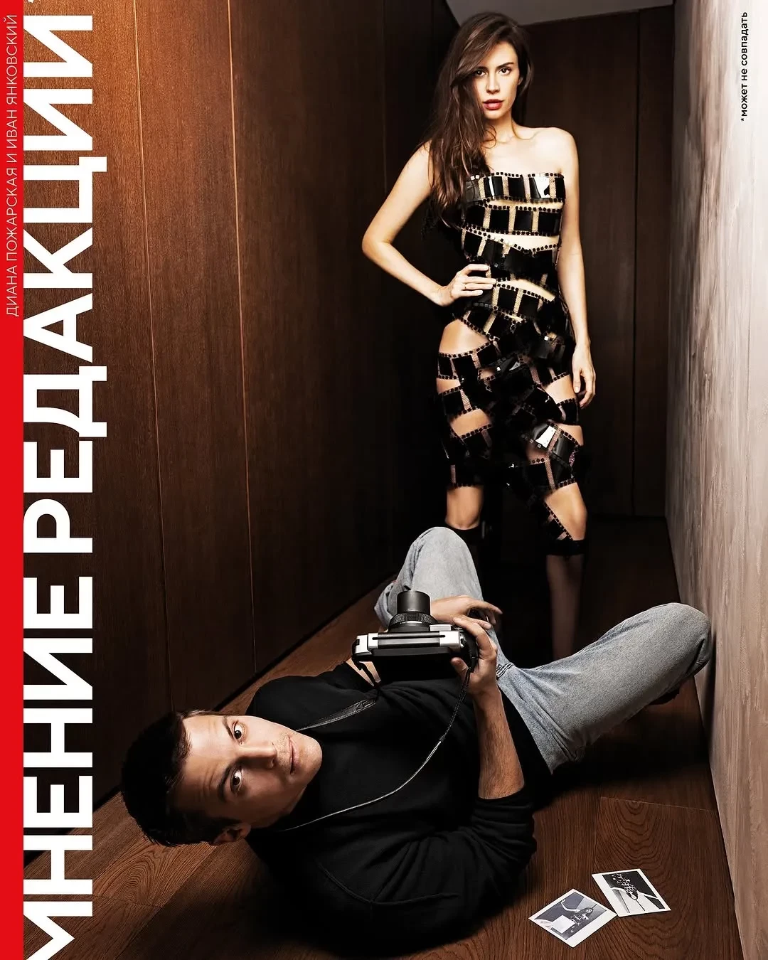 Иван Янковский и Диана Пожарская украсили новый номер журнала "Мнение редакции* может не совпадать", главным редактором которого стал стилист Алеко. Популярные актёры и супруги снялись для обложки в образах модели и фотографа: Диана позировала, обёрнутая в фотоплёнку, а Иван "снимал" её на камеру.