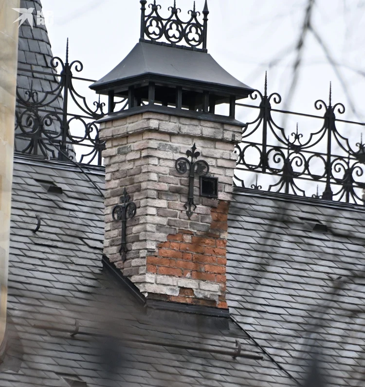 На трубе отбита облицовка, крыша замка покрылась потеками.