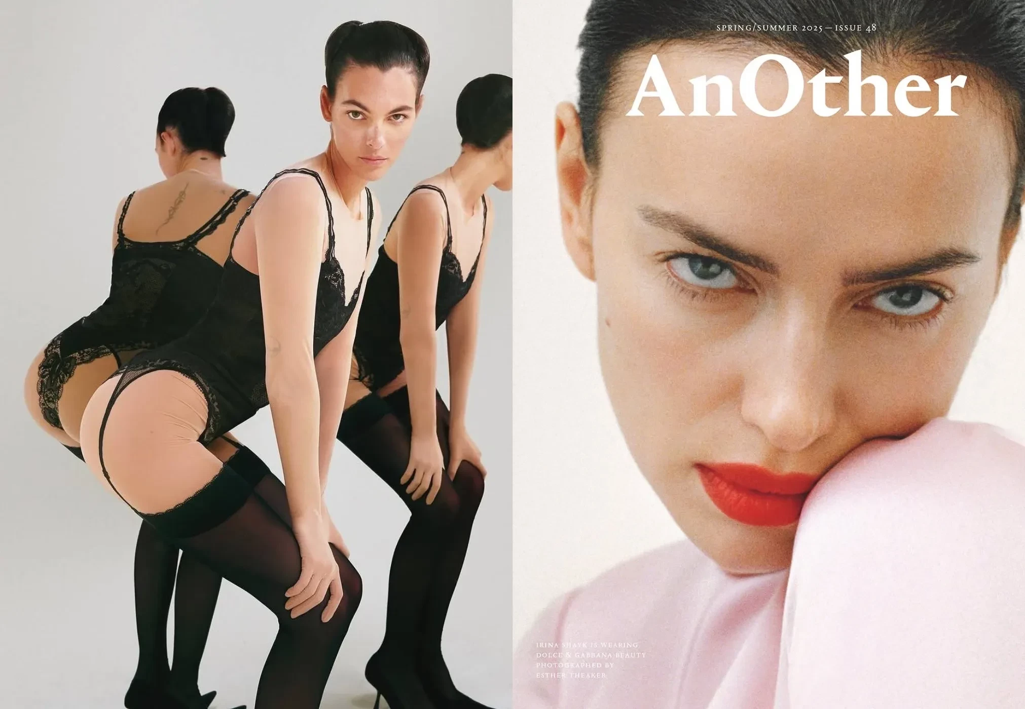 39-летняя Ирина Шейк и 26-летняя Виттория Черетти стали героинями нового номера журнала AnOther сезона весна-лето — 2025 и снялись в фотосессии. Российская супермодель примерила образы Dolce & Gabbana, а итальянская звезда позировала в вещах Balenciaga.
