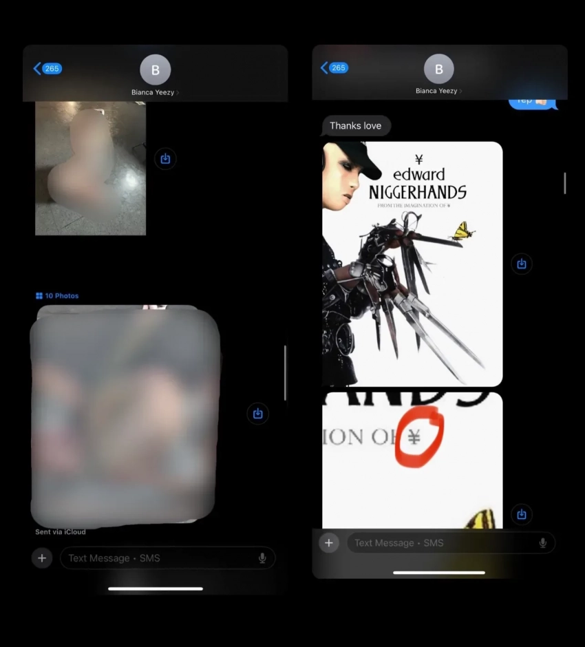 Сообщения от Бьянки Цензори с изображениями порно и расистскими оскорблениями/Фото: личный архив Пьера Луи Овре/SubstackВ последнее время Канье Уэст и Бьянка Цензори стали самыми обсуждаемыми персонами в мире. В начале февраля они вместе появились на церемонии вручения премии "Грэмми", где Бьянка вышла на красную дорожку фактически голой: на ней было прозрачное платье из сетки без нижнего белья. Ещё через какое-то время артист выложил посты в соцсети X, где объявил себя нацистом, рассказал о доминировании над женой и опубликовал несколько оскорбительных сообщений о евреях. Позже он также постил порноролики и запускал продажу футболок со свастикой. Недавно появились новости о том, что супруги решили расстаться, но представители Канье это опровергли.