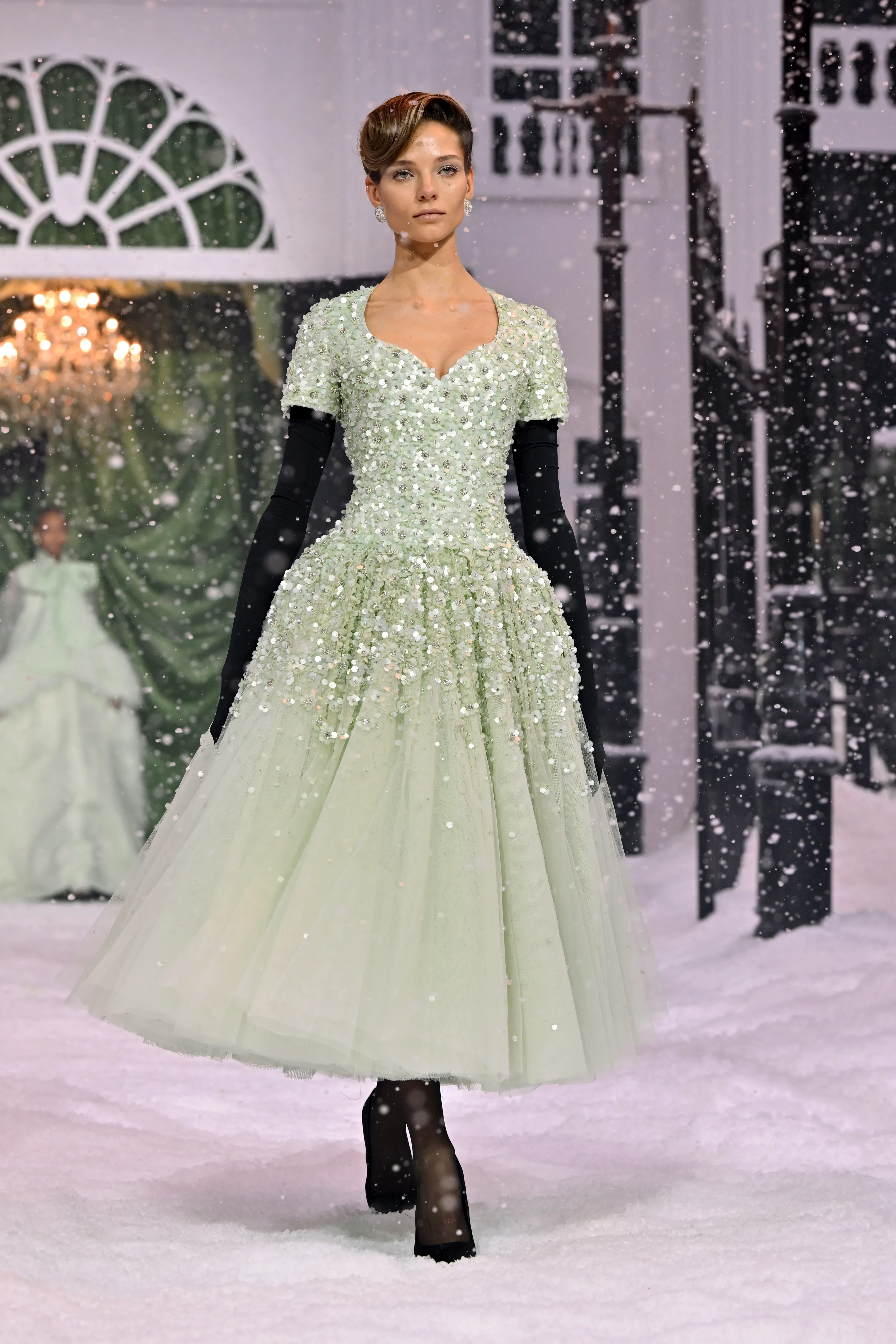 Леди Элайза и Амелия Спенсер/Фото: Jeff Spicer/Getty ImagesПо подиуму среди других моделей прошлась 26-летняя Алеся Кафельникова. На ней было платье нежно-зеленого цвета и длинные черные перчатки. Отметим, что Алеся после непродолжительного перерыва вновь активно занялась моделингом: недавно она начала сотрудничать с престижным британским агентством Storm Management и опубликовала новую видеовизитку.