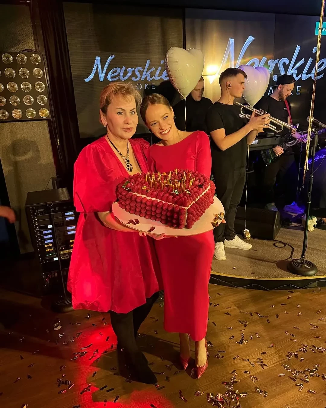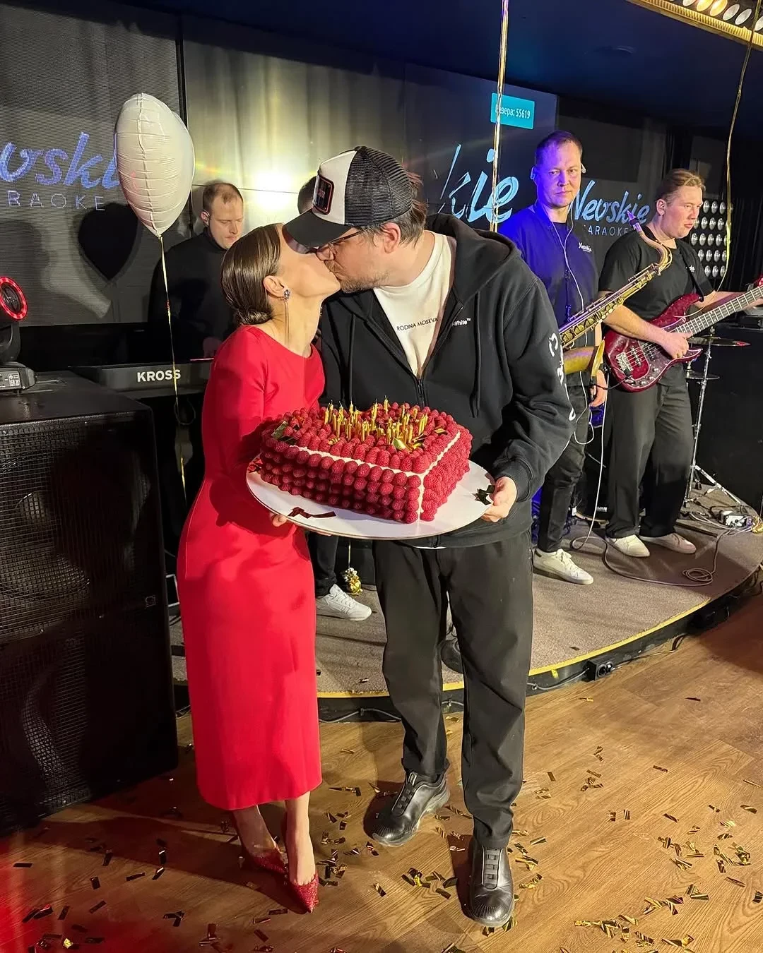 Катерина позировала в красном платье и туфлях в тон, а её супруг надел белую футболку, спортивную кофту и кепку. Среди гостей была свекровь Ковальчук Наталья Харламова, с которой невестка находится в хороших отношениях. Мать Харламова тоже выбрала наряд красного цвета. Весь вечер гости пели и танцевали, а позже на сцену вынесли трендовый праздничный торт с малиной, который последнее время особенно популярен у селебрити.