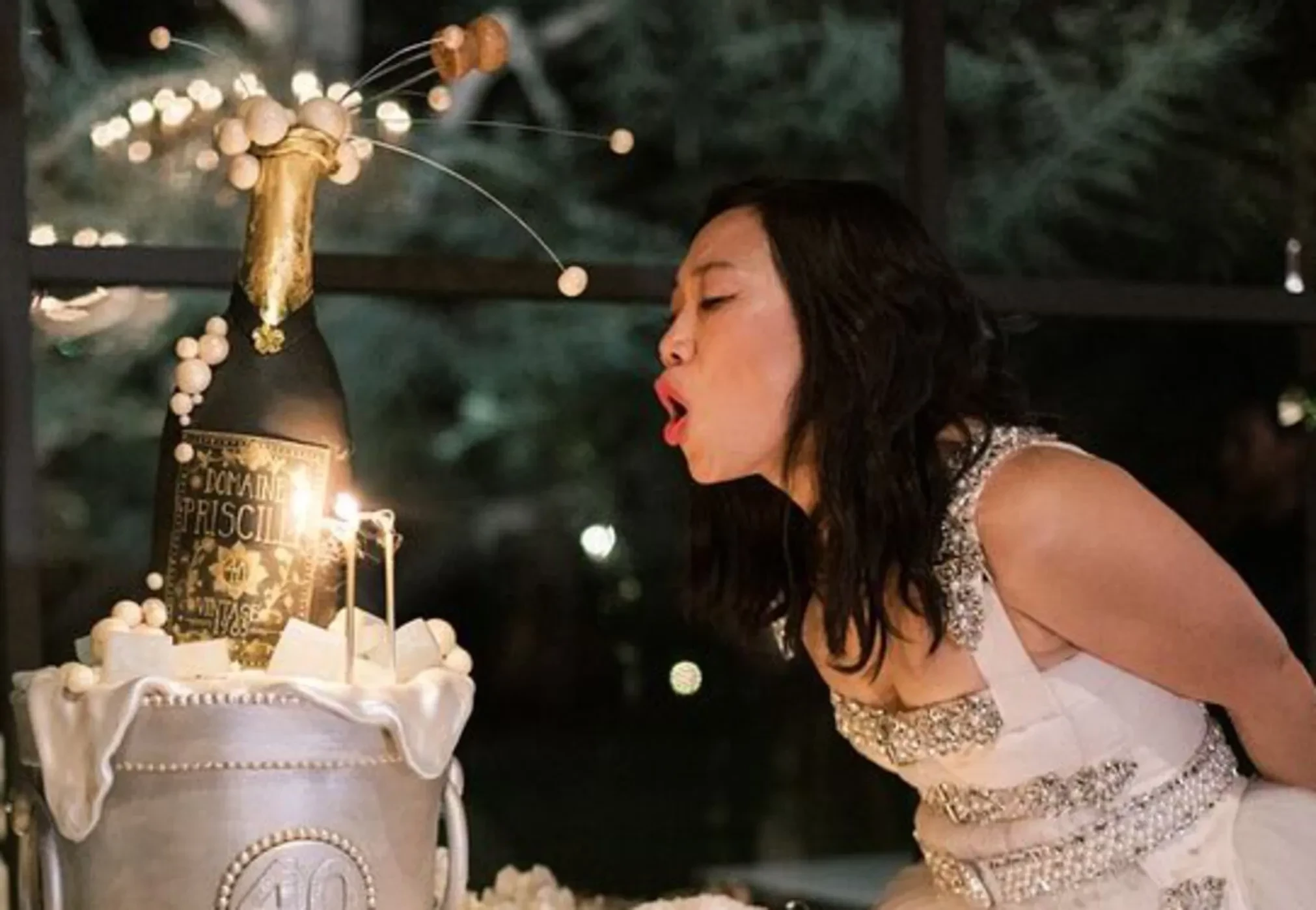 На снимках Присцилла позирует сразу в нескольких нарядах: блестящем белом, чёрном с открытой спиной и перчатками в тон и красном без рукавов. На одной из фотографий можно увидеть торт, выполненный в стиле ведёрка со льдом и шампанским в нём, а на самом ведёрке нарисована цифра 40.