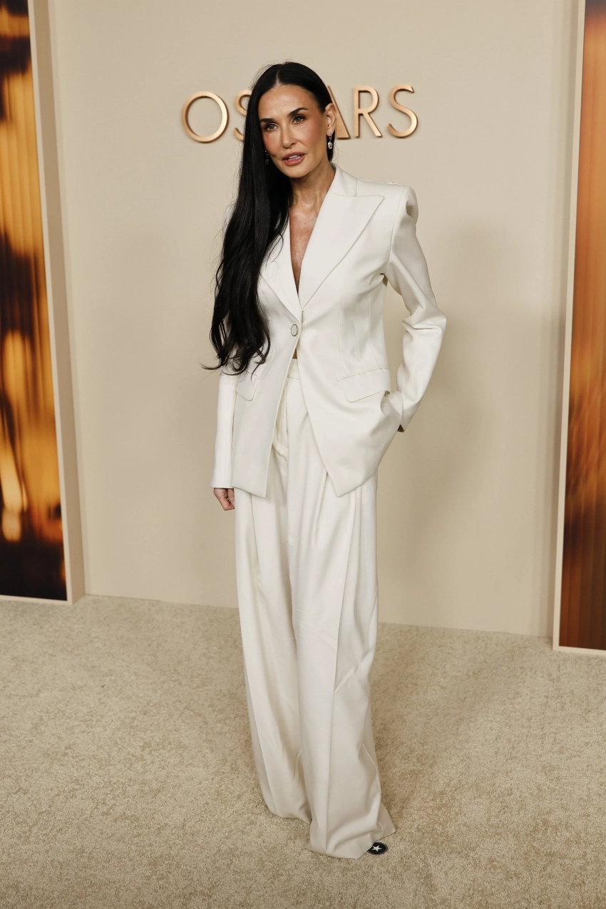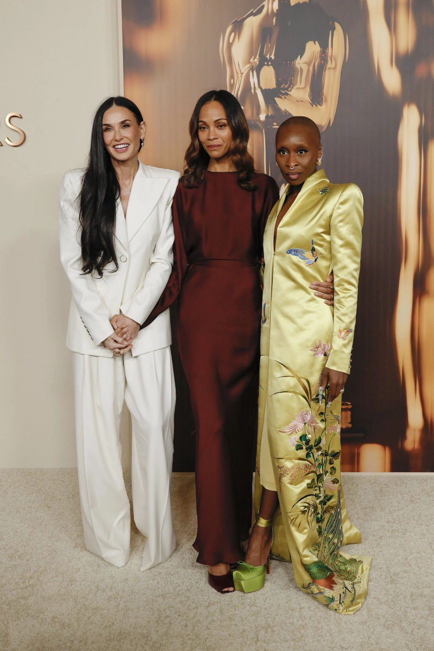 Деми Мур/Фото: Frazer Harrison/Getty ImagesАриана Гранде/Фото: Frazer Harrison/Getty ImagesЗои Салдана/Фото: Frazer Harrison/Getty ImagesТимоти Шаламе/Фото: Frazer Harrison/Getty ImagesСинтия Эриво/Фото: Frazer Harrison/Getty Images62-летняя Деми Мур появилась в белом костюме от Нины Риччи. Зои Салдана выбрала для мероприятия бордовое платье со свободными пышными рукавами. Синтия Эриво появилась в жёлтом платье в пол с вышивкой бабочек и цветов. Звезда "Аноры" Майки Мэдисон пришла в тёмно-синем платье без бретелек.