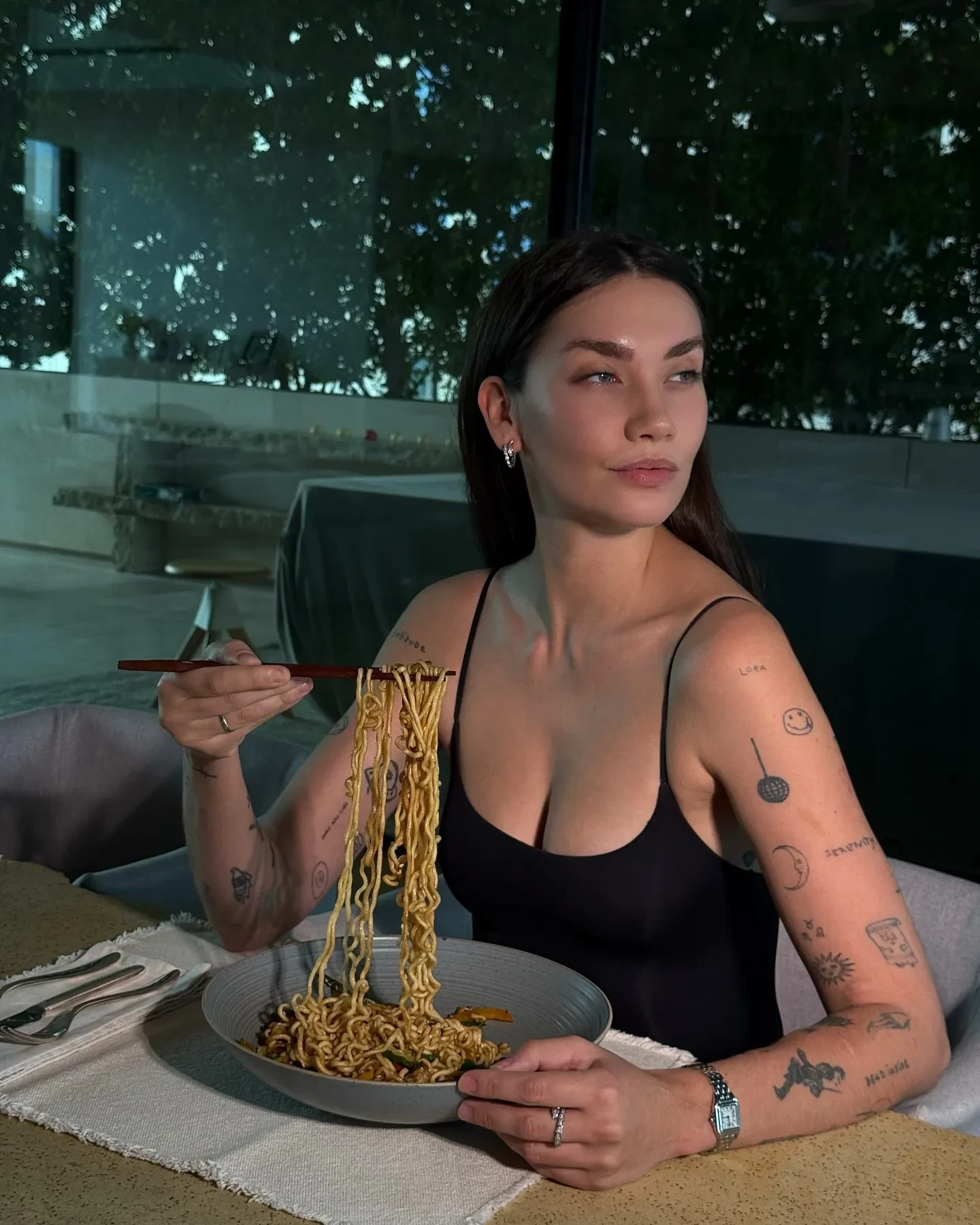 На снимках Истомина позирует на фоне высоток, на вечерней улице с розой, в ресторане с едой, а также у моря с дочерью на руках.