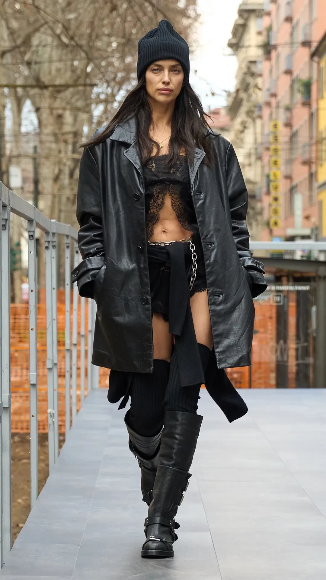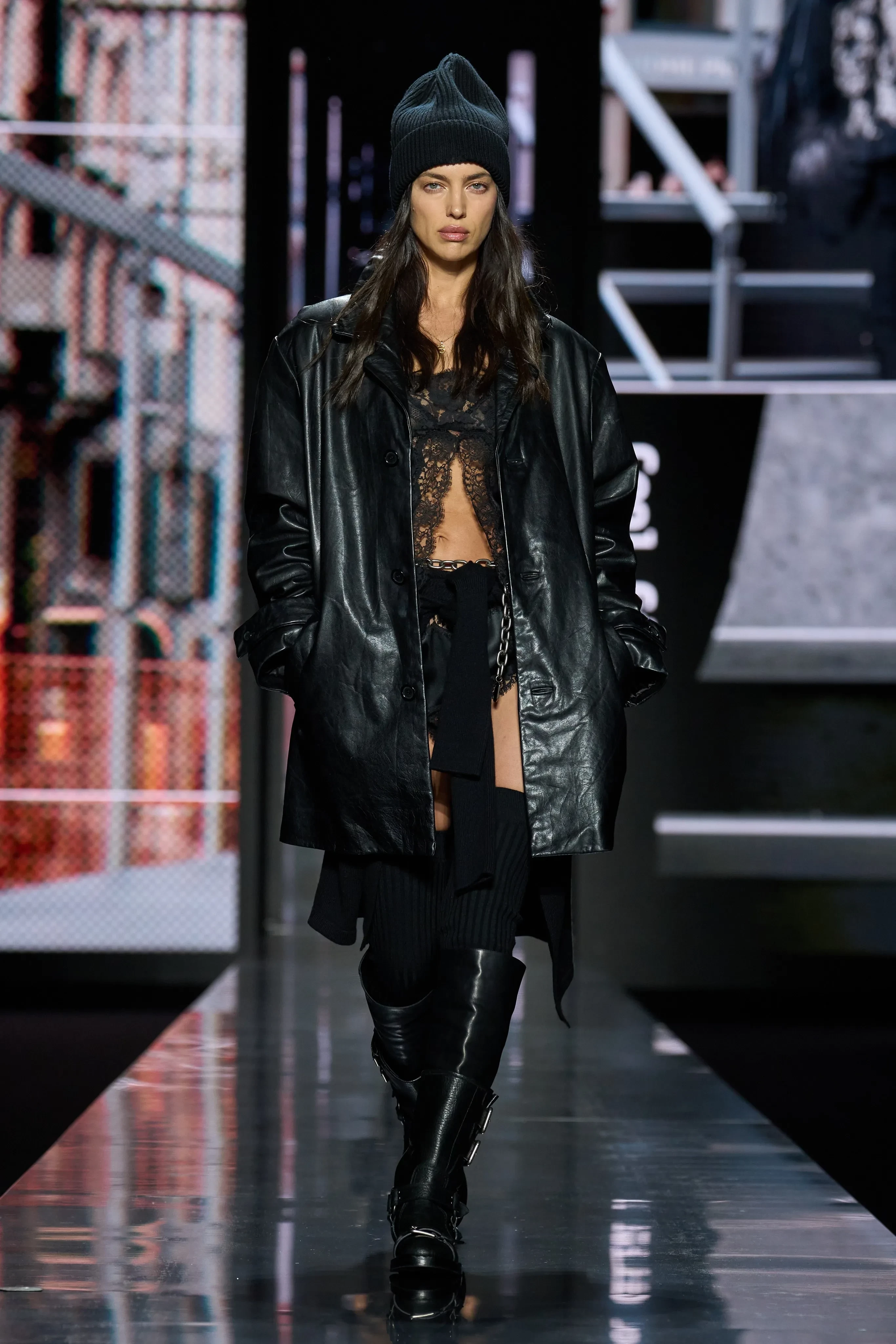 Фай Хадра/Фото: Dolce & GabbanaОснователи бренда Доменико Дольче и Стефано Габбана устроили показ прямо на улицах Милана, который закончился вечеринкой под открытым небом, где с диджей-сетом выступила участница Måneskin Виктория Де Анджелис. Ирина Шейк, Амелия Грей и другие топ-модели начинали дефилировать на улице и продолжали в здании, а на финальном проходе они вернулись на улицу и танцевали под музыку под восторженные аплодисменты прохожих. В своей осенней коллекции бренд Dolce & Gabbana представили вещи, идеально подходящие для вечеринок до утра: кожаные плащи, шубы, короткие шорты, кружевные топы и платья с перьями, высокие сапоги, трикотажные чулки и шапки, чтобы точно не замёрзнуть на open air. Закрыла шоу грузинская модель Матильда Гварлиани в мини-платье, расшитом драгоценностями.