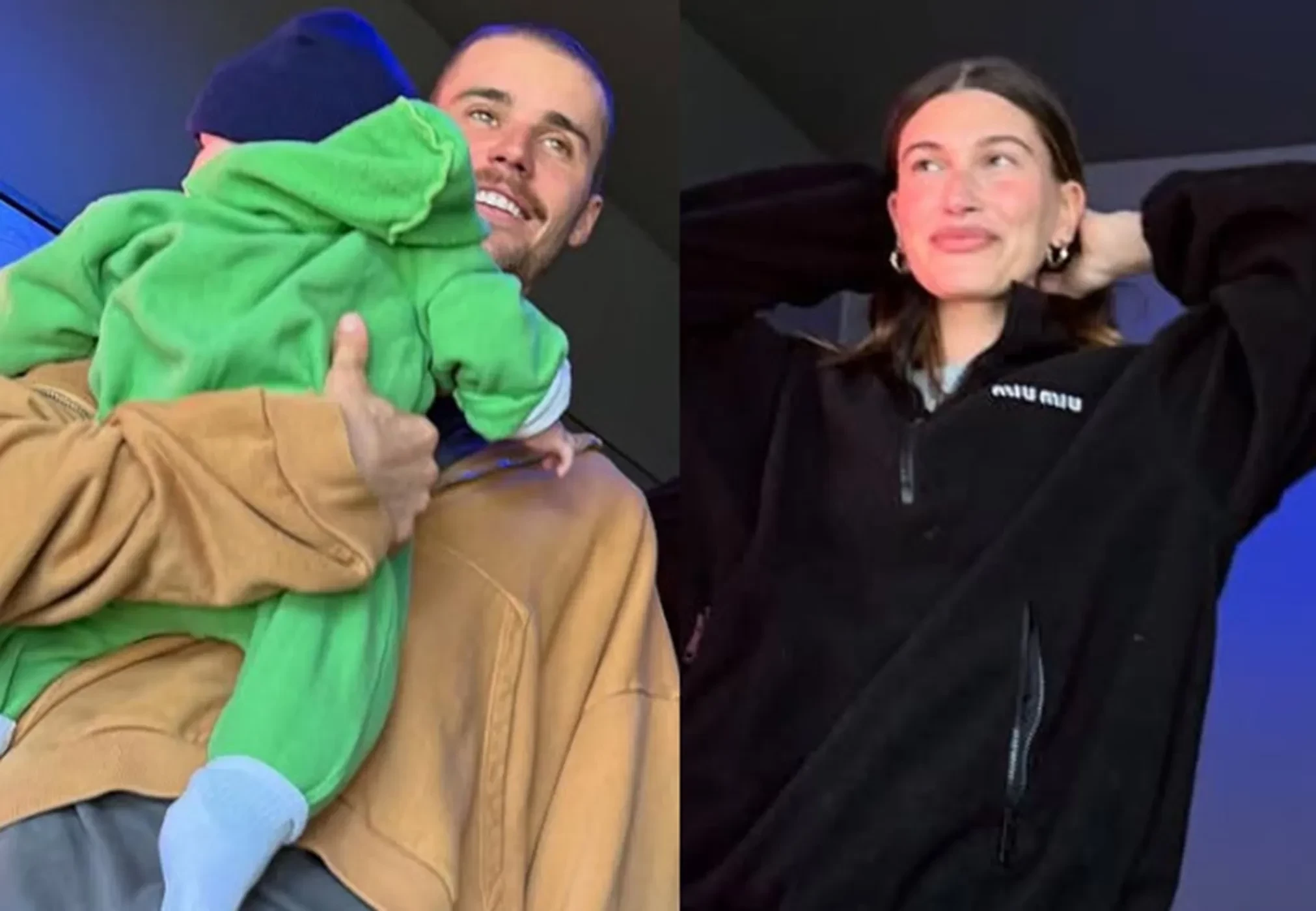На одном снимке Бибер держит в руках Джека Блюза, одетого в зелёный комбинезон и синюю шапочку, рядом стоит улыбающаяся Хейли. На другом пара идёт по загородной дороге с коляской. Джастин также показал, как его 28-летняя жена выносит ему праздничный торт со свечами.