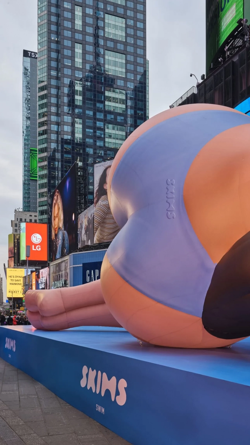 Ким Кардашьян разместила свою 18-метровую копию в центре Таймс-сквер в честь новой коллекции купальников своего бренда Skims. Концепцию разработала Эми Куле из креативного агентства Merry Wonderer.