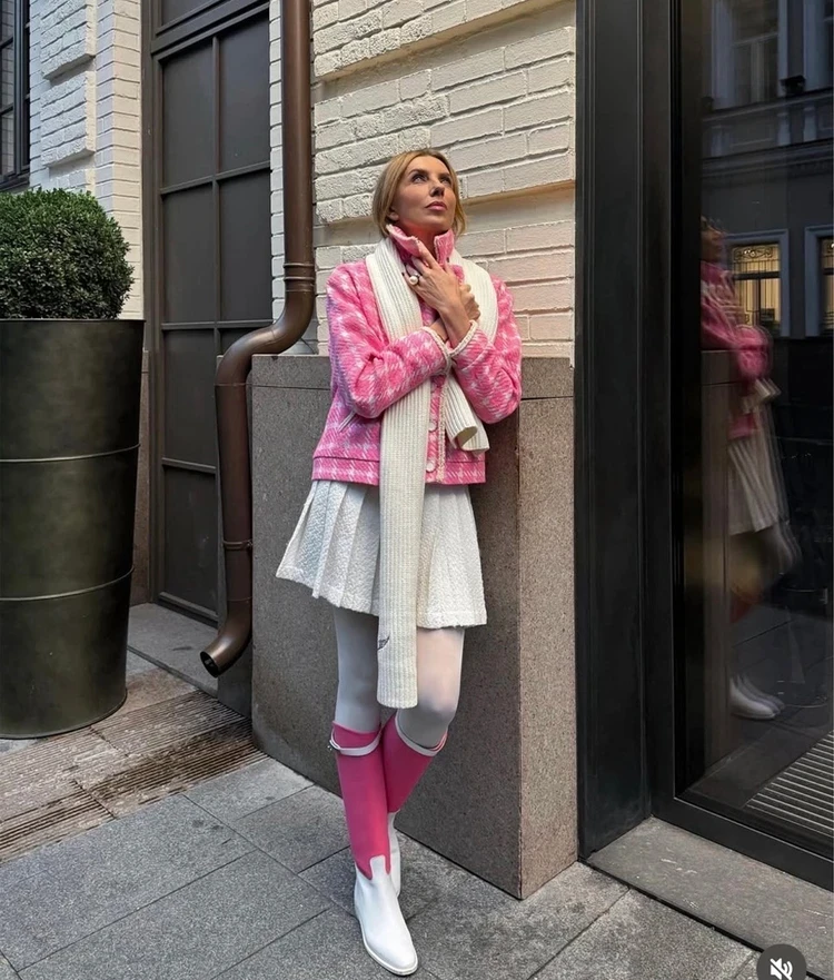 Светлана, которая обожает модные эксперименты, собрала образ в стиле Barbie. Хотя бум на эту куклу в связи с выходом одноименного фильма уже прошел, розовый цвет носить мы не перестали. Правда, его стало меньше. Бондарчук сочетала розовый твидовый жакет с белой юбкой, такого же цвета колготками и бело-розовыми сапогами, которые, как будто только что позаимствовала у Барби. Лук получился ярким и кукольным. Почему бы и нет? Ведь весна за окном.