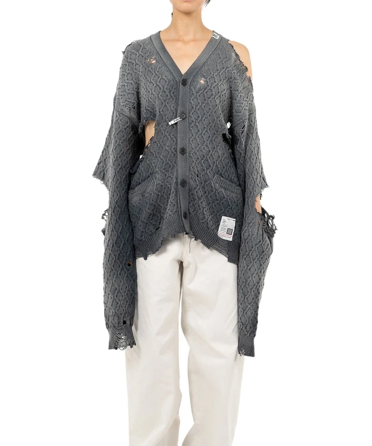 Японский дизайнер Ясухиро Михари, который уже составляет нешуточную конкуренцию Демне Гвасалии, предлагает модникам нарядиться в лохмотья в прямом смысле слова. В ассортименте бренда можно найти целую серию кардиганов, которые выглядят так, будто их только что отобрали у бродяг. Цена дырявой «ветоши» — 37 100 рублей.