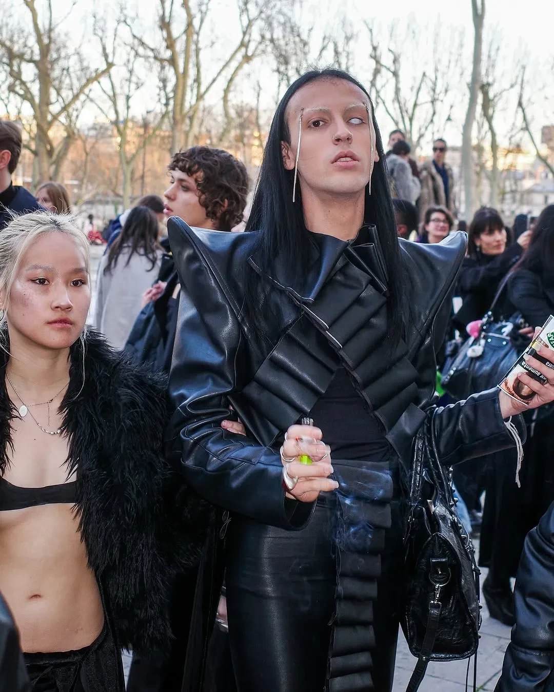 Гости показа Rick Owens/Фото: supercupmatcha/Instagram*В новой коллекции Рик Оуэнс представил верхнюю одежду из кожи с высокими воротниками, юбку из "чешуи", изделия с мехом, короткие куртки, брюки клёш, платья с "рваным" подолом и сапоги с широким голенищем.