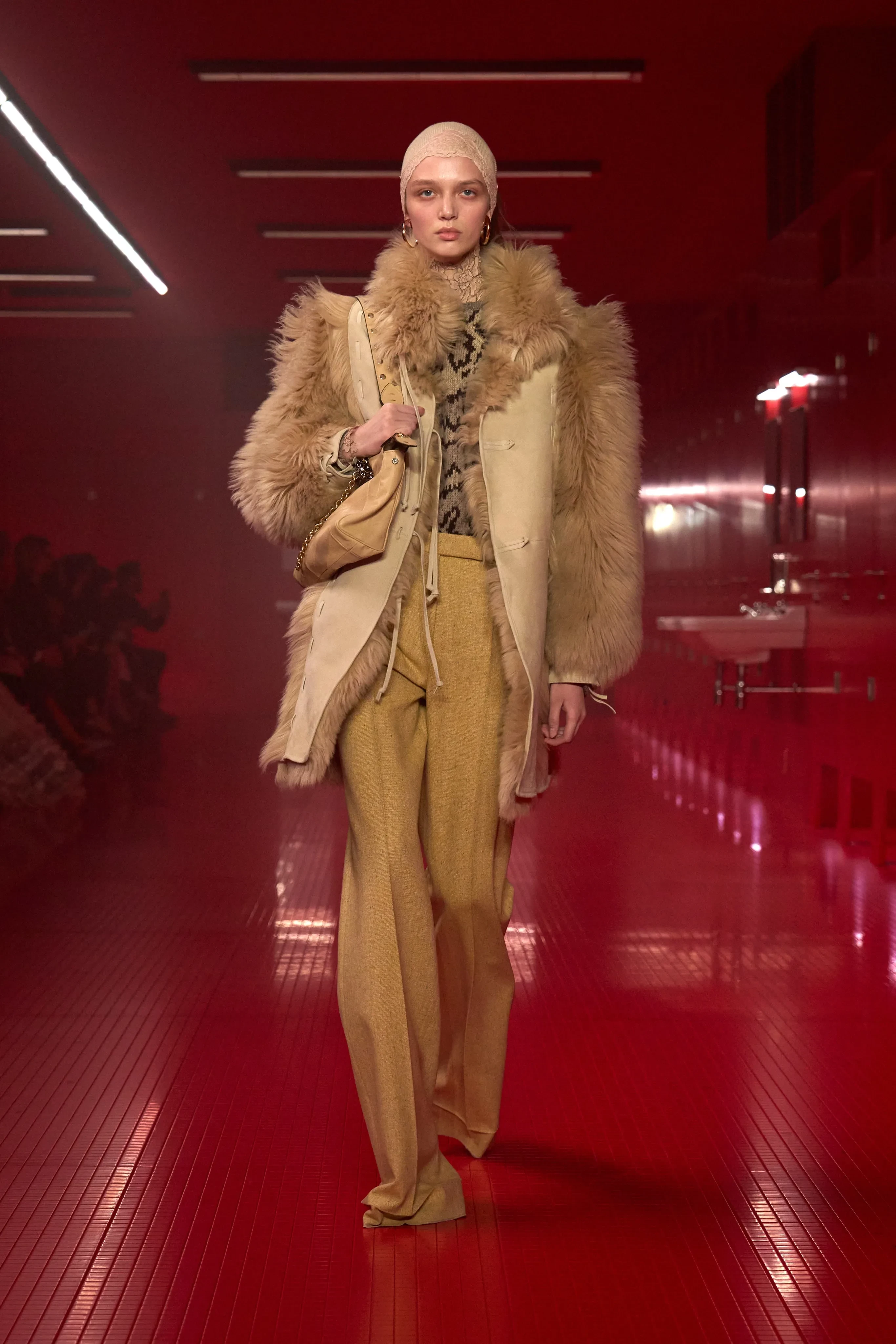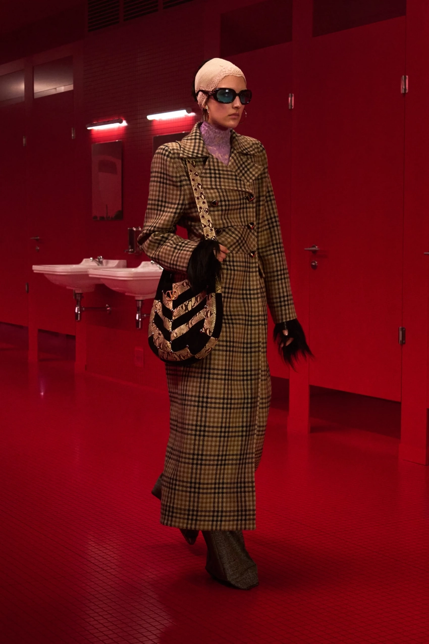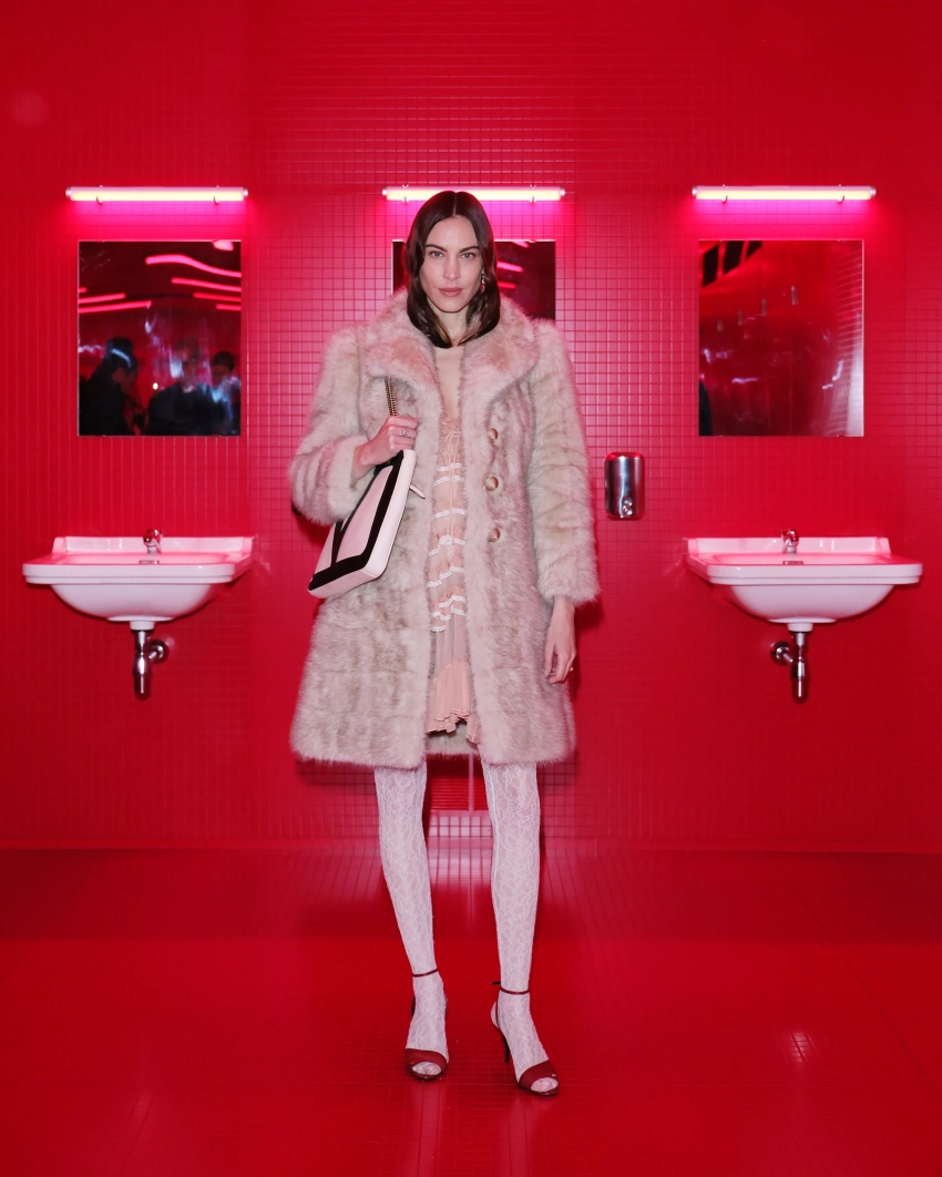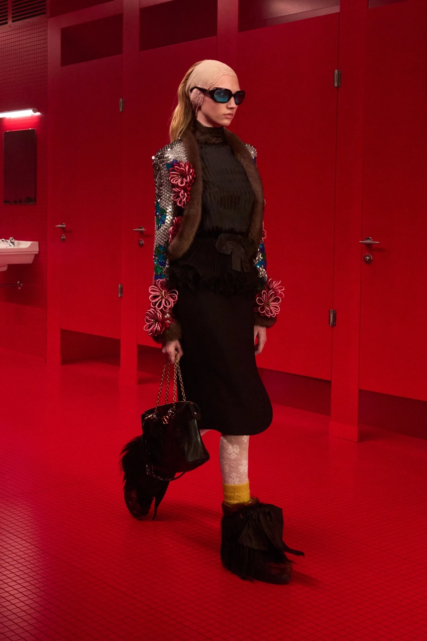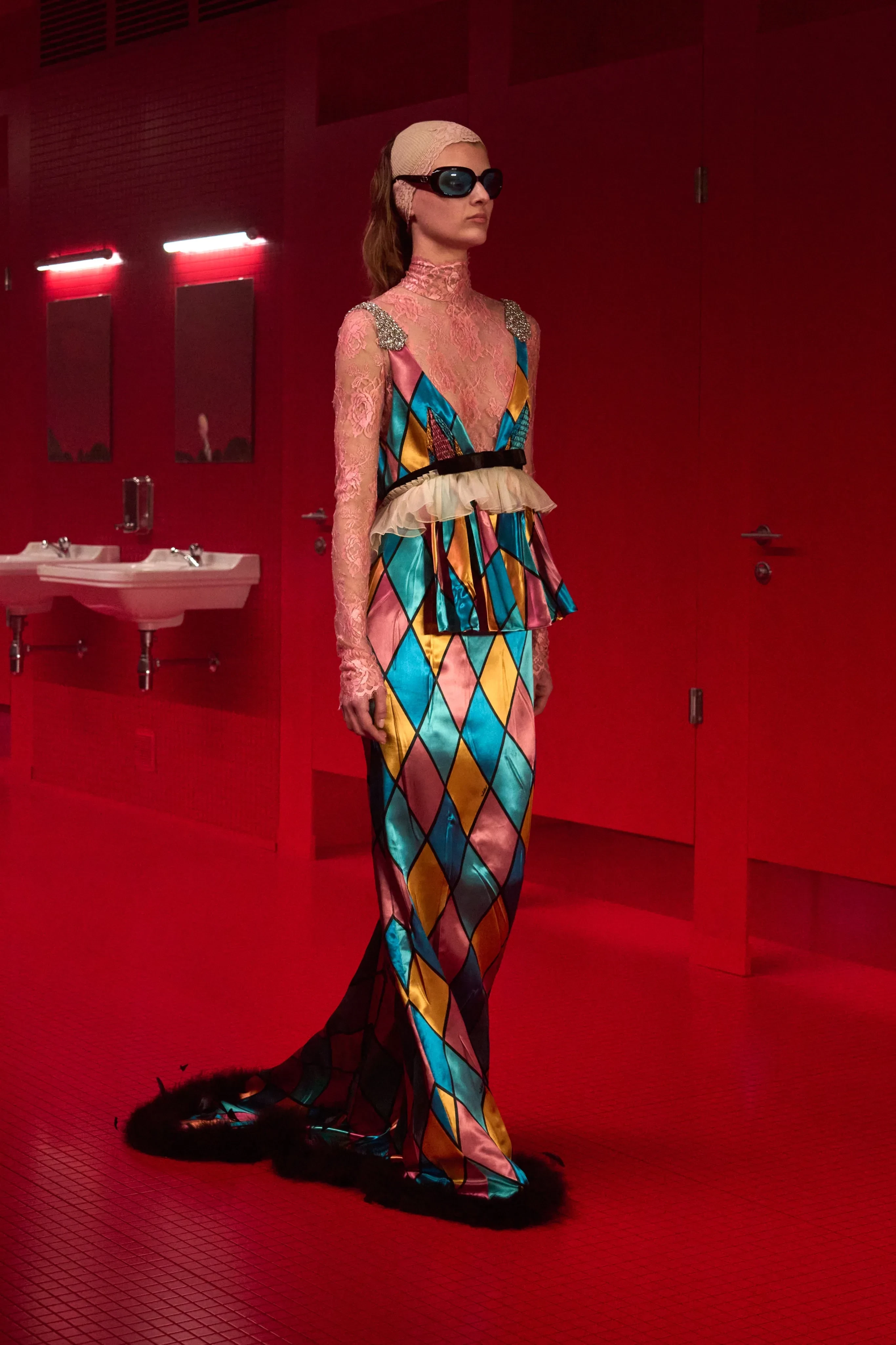 Алина Цыганова/Фото: oxana_bondarenko/Instagram*Свою новую коллекцию креативный директор бренда Алессандро Микеле показал в декорациях общественных туалетов в ночных клубах, где модели дефилировали на фоне кабинок в шубах, вечерних платьях, кружевных колготках и боди. Они также носили чалму на голове, туфли с бантами и стразами, леопардовый принт, изделия с меховой отделкой и солнцезащитные очки в ретростиле.