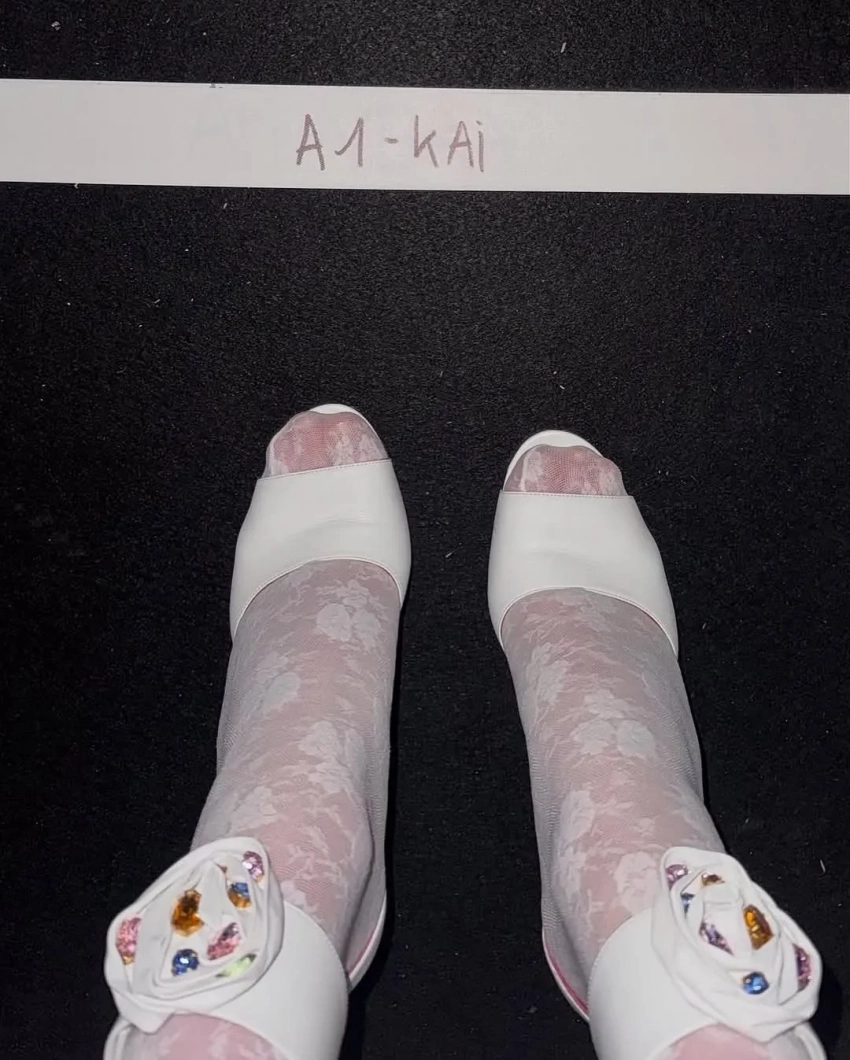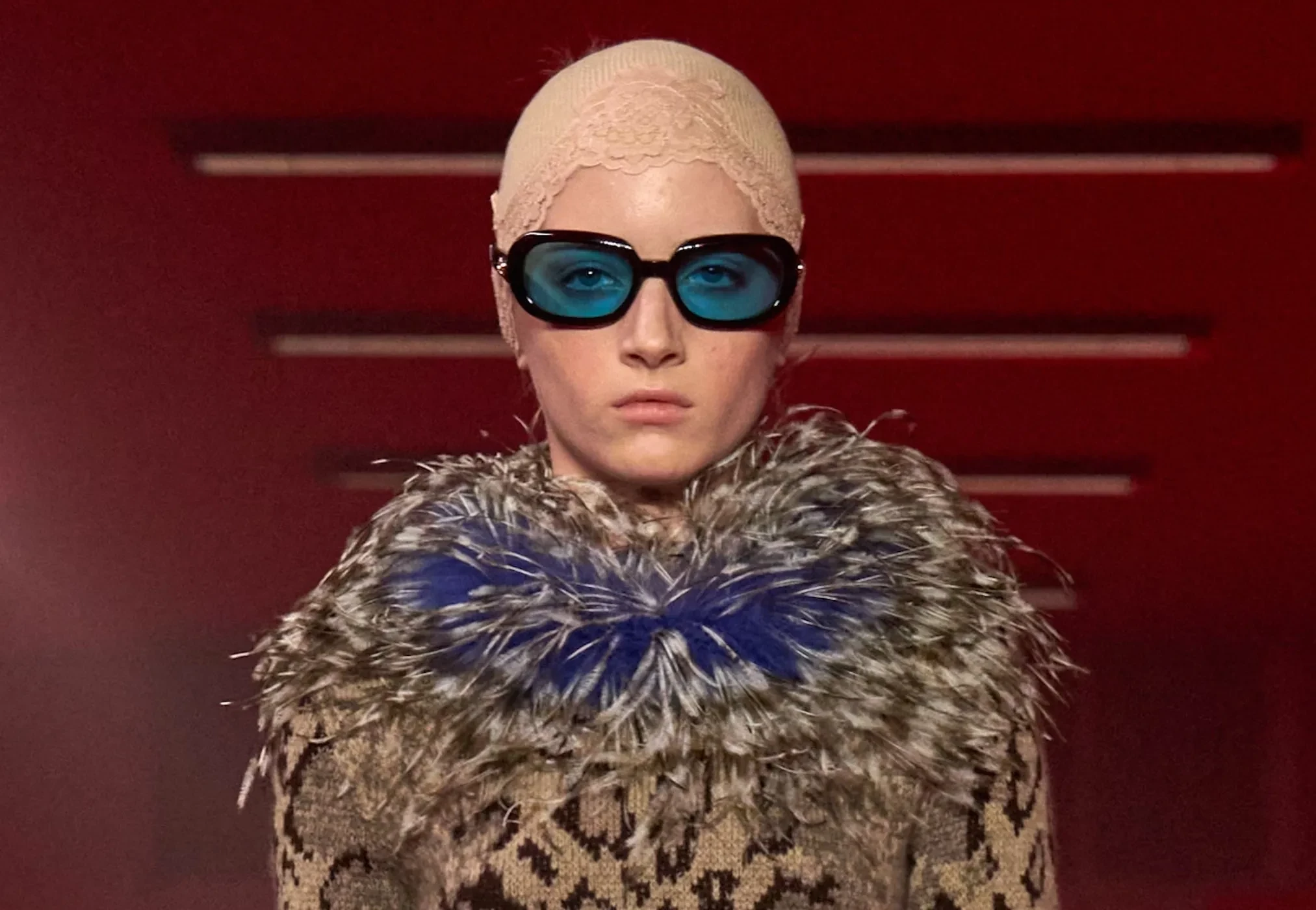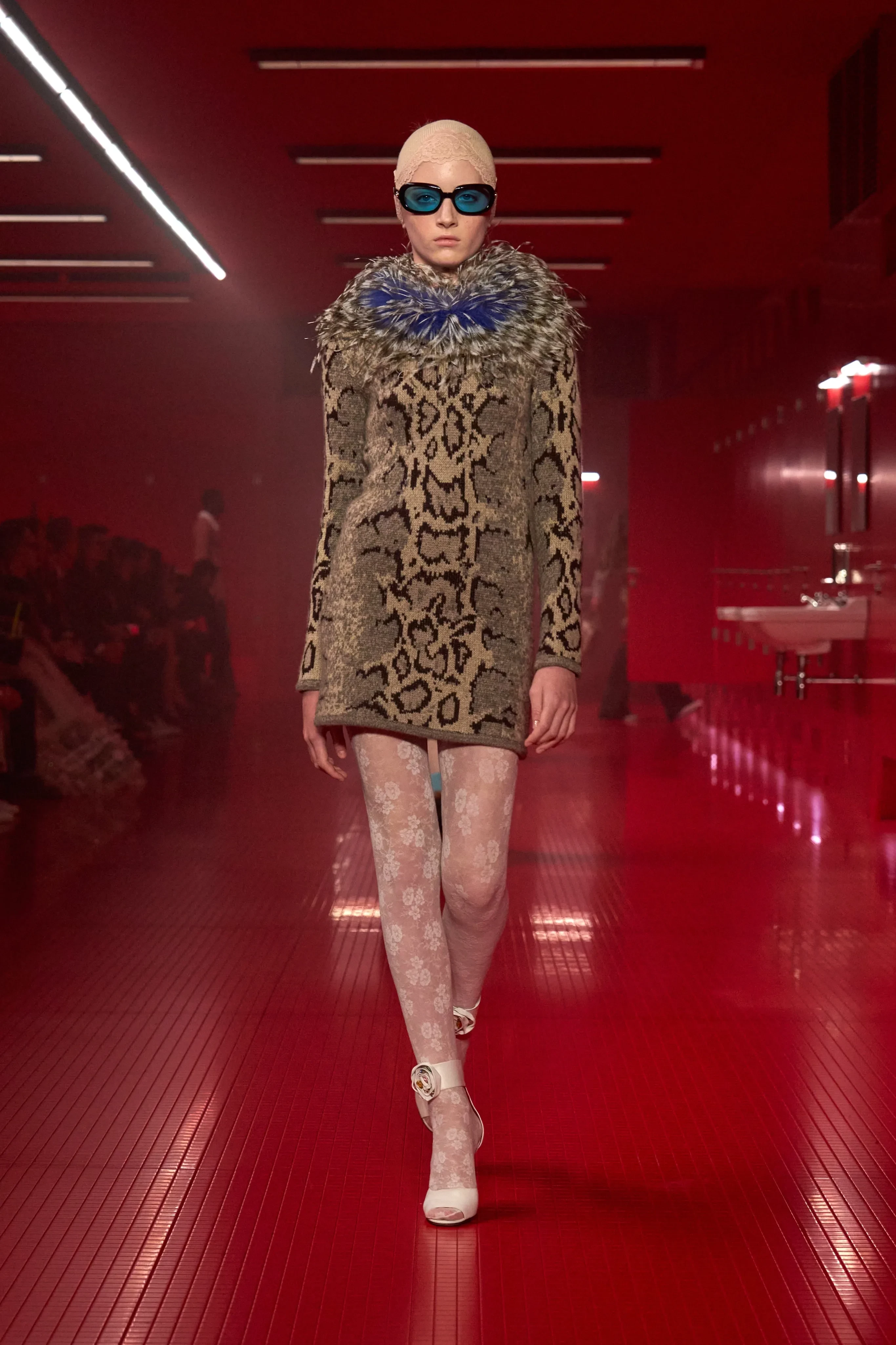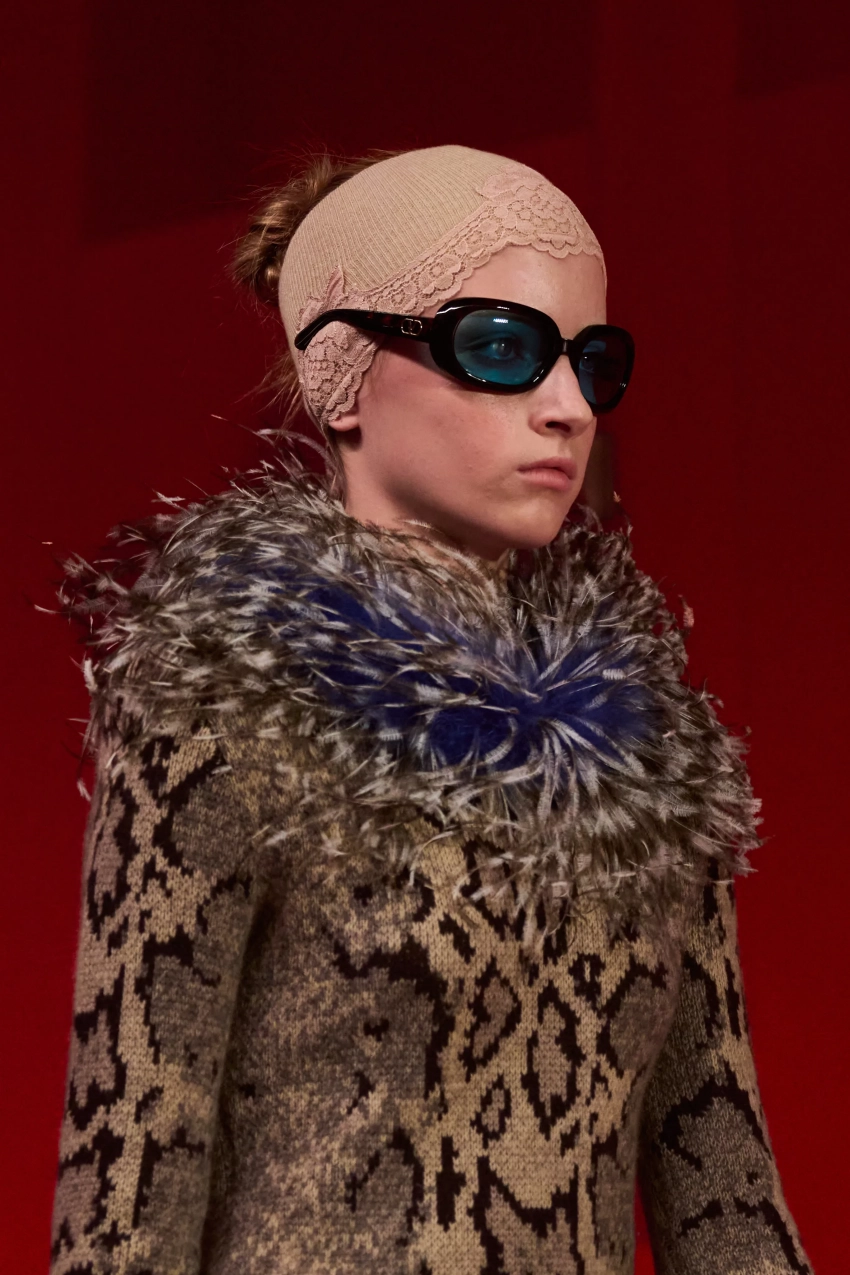Кай Шрайбер прошёлся по подиуму в меховом леопардовом платье, белых ажурных колготках и босоножках на каблуках. Образ дополнили солнцезащитные очки в ретростиле и кружевная повязка на голове.