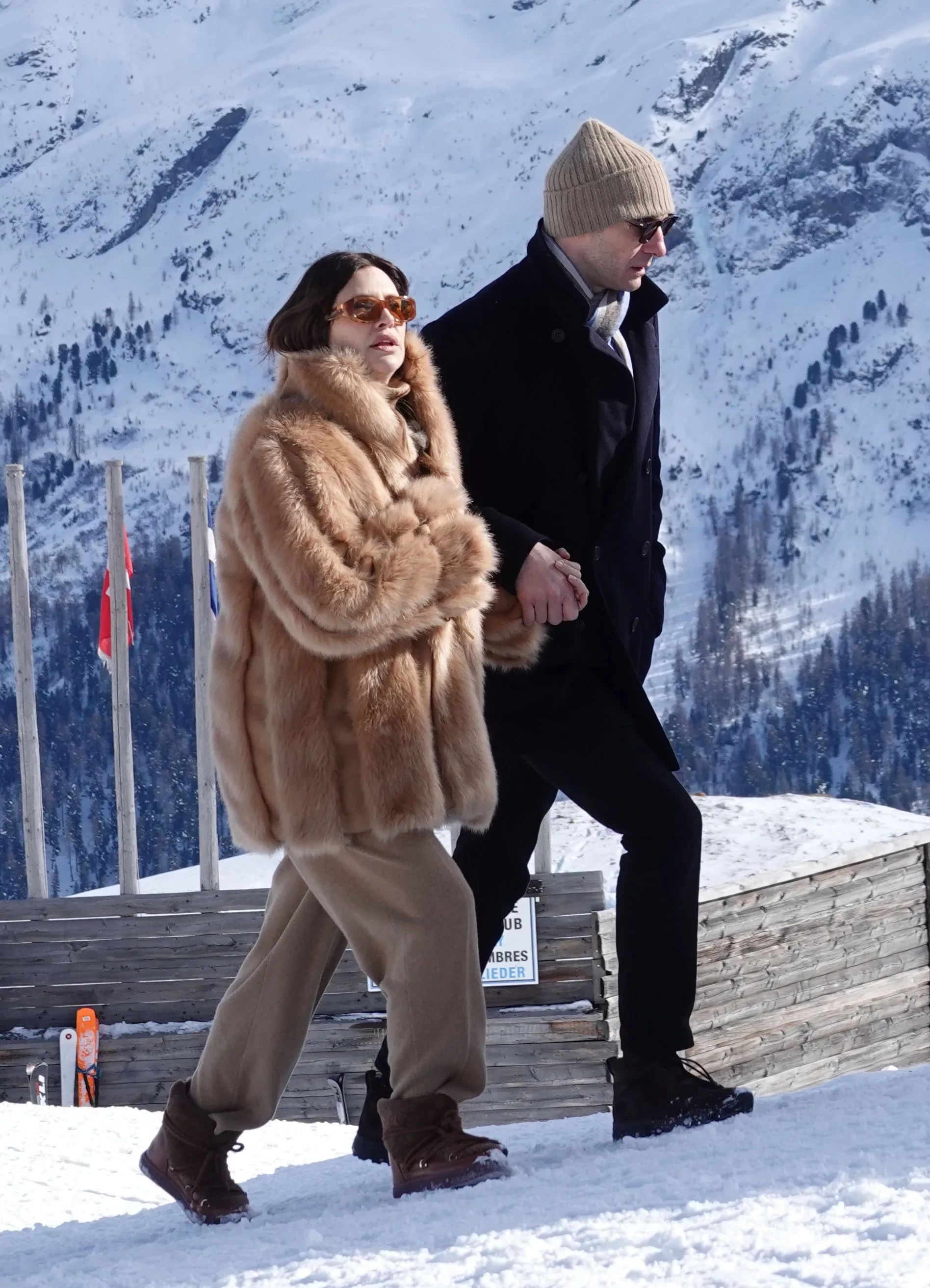 Судя по кадрам, 43-летняя Жукова и Ниархос с друзьями отправились обедать в местный ресторан Corviglia Club. На Дарье были брюки свободного кроя песочного оттенка, вязаный кардиган и шуба в тон, а также ботинки-луноходы бренда Inuikii. 39-летний греческий миллиардер предпочёл классический стиль в одежде, облачившись в приталенное пальто и зауженные брюки.