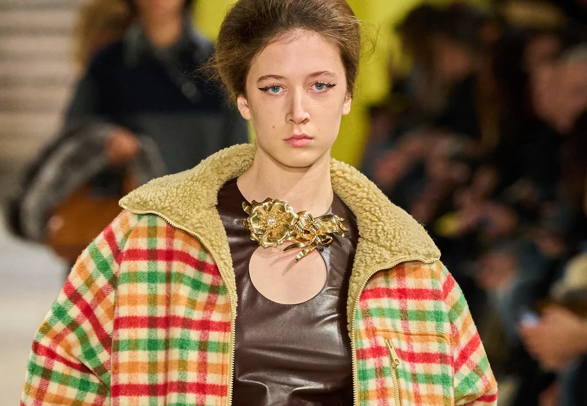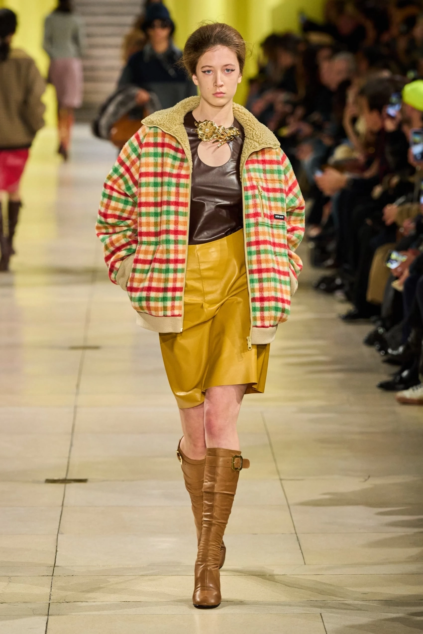 16-летняя Сандэй Роуз предстала в коричневом кожаном топе, кожаной юбке горчичного цвета с сапогами в тон и в бомбере в клетку. За кулисами шоу она рассказала Vogue, что ей посоветовали делать шире шаг на подиуме, чтобы выглядеть элегантнее, а также что в этот выход, который стал вторым в её жизни, она чувствовала себя "намного увереннее".