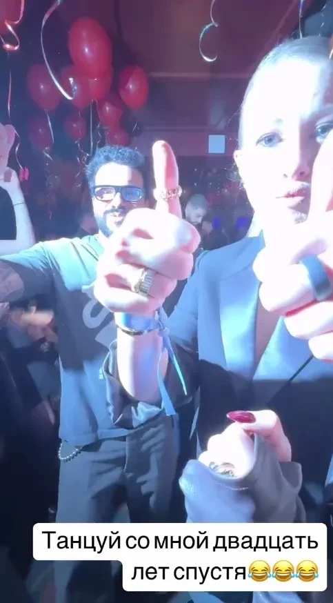 https://t.me/spletnikru2024/26520В другом видео Собчак "засветилась" на вечеринке в компании Тимати (настоящее имя — Тимур Юнусов): в ролике 43-летняя ведущая и рэпер танцуют вместе под клубный трек. При этом Ксения напомнила музыканту про их скандальный клип 20-летней давности.