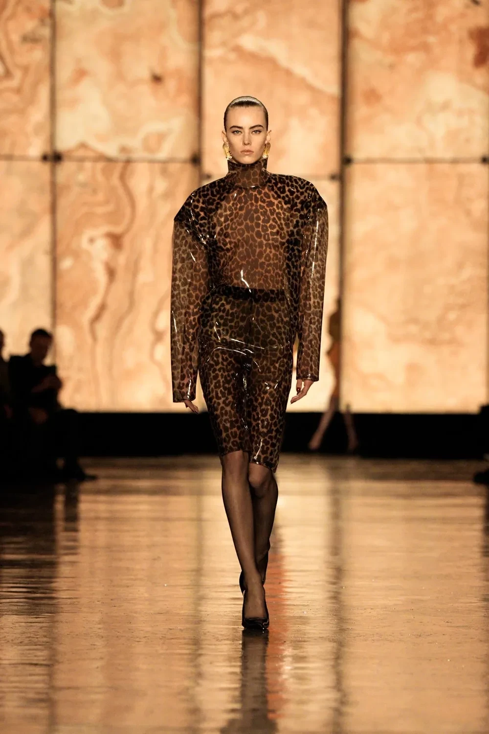 Айрис Лоу/Фото: Pascal Le Segretain/Getty ImagesВ новом сезоне креативный директор Saint Laurent Энтони Ваккарелло ссылался на кутюрные коллекции Ива Сен-Лорана 1990-х годов. Модели дефилировали в пальто, платьях и блузах с квадратными плечами, что свойственно эстетике бренда. Акцентами образов стали пояса на бёдрах, завязанные в виде бантов, массивные серьги, платья из лаковой кожи с леопардовым и цветочным принтами, комплекты из кружева, пышные юбки в пол в сочетании с кожаными куртками.