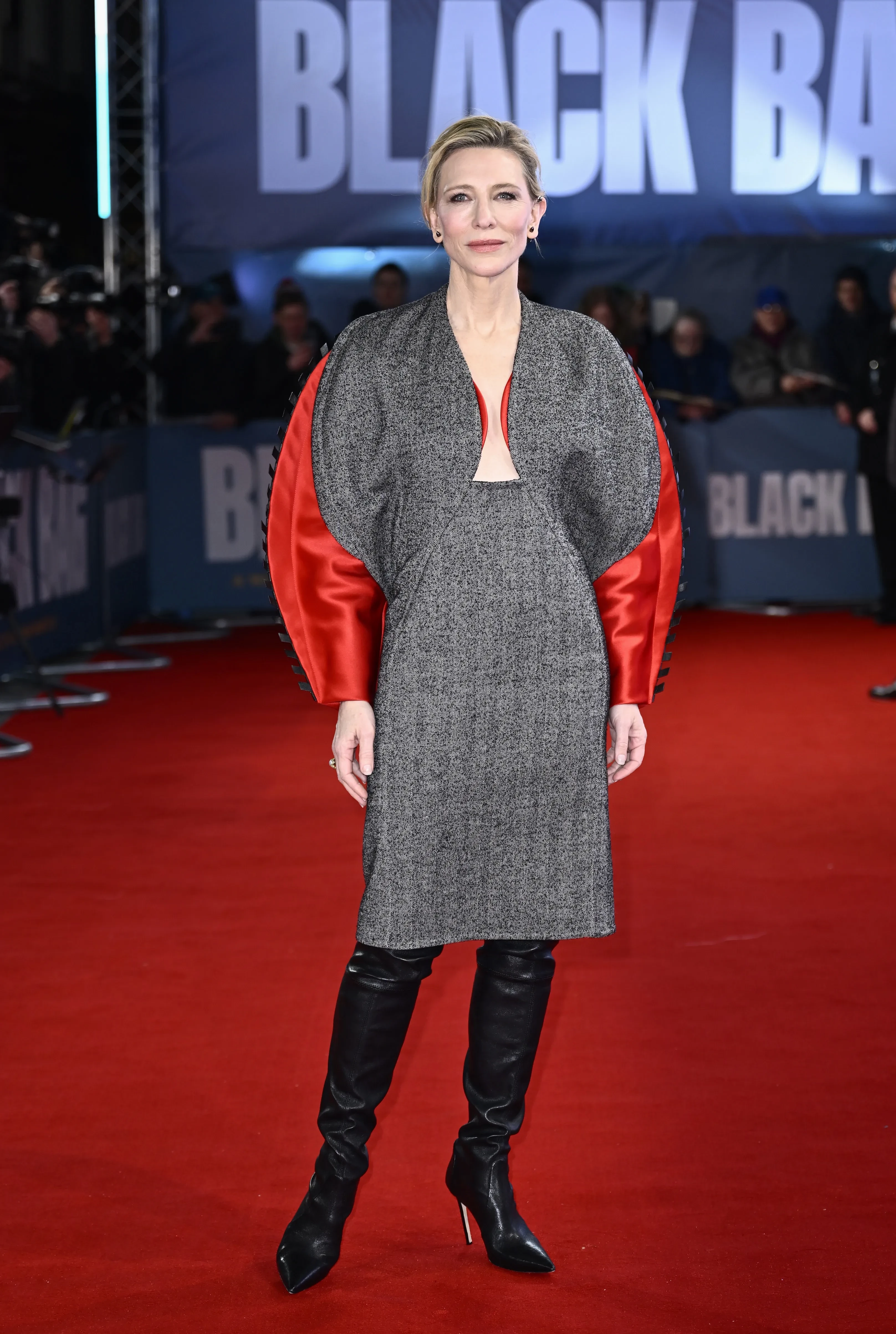 55-летняя Кейт Бланшетт надела приталенное платье из шерсти с красными рукавами, вырезом и открытой спиной. Платье сделал бренд Louis Vuitton, вдохновившись коллекцией осень-зима — 2023.