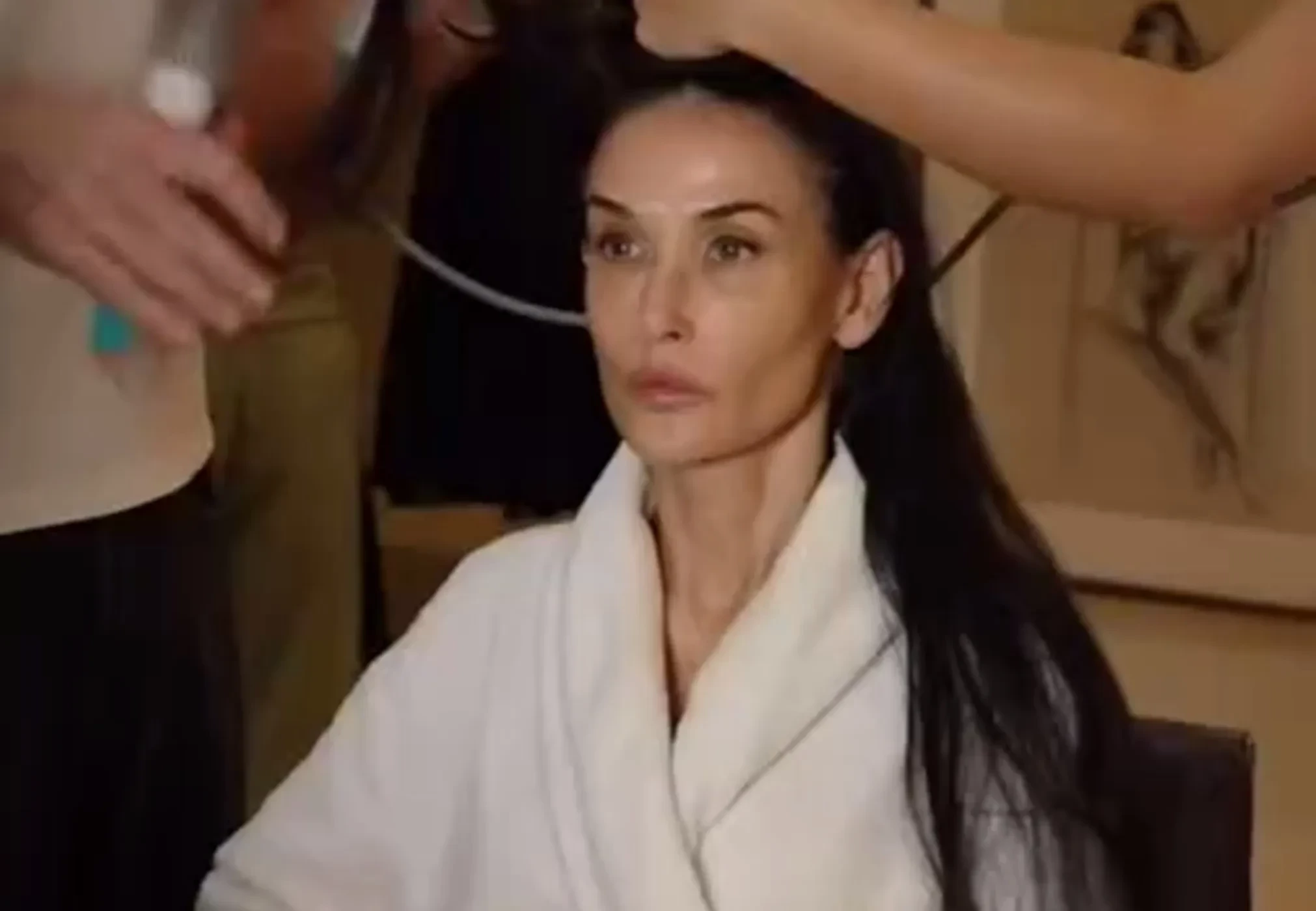 В ролике над готовящейся выйти на красную дорожку церемонии Мур работает целая команда: ей в несколько рук делают укладку и готовят лицо для нанесения макияжа. При этом камера запечатлела у Деми неровности кожи, круги под глазами и пигментные пятна.