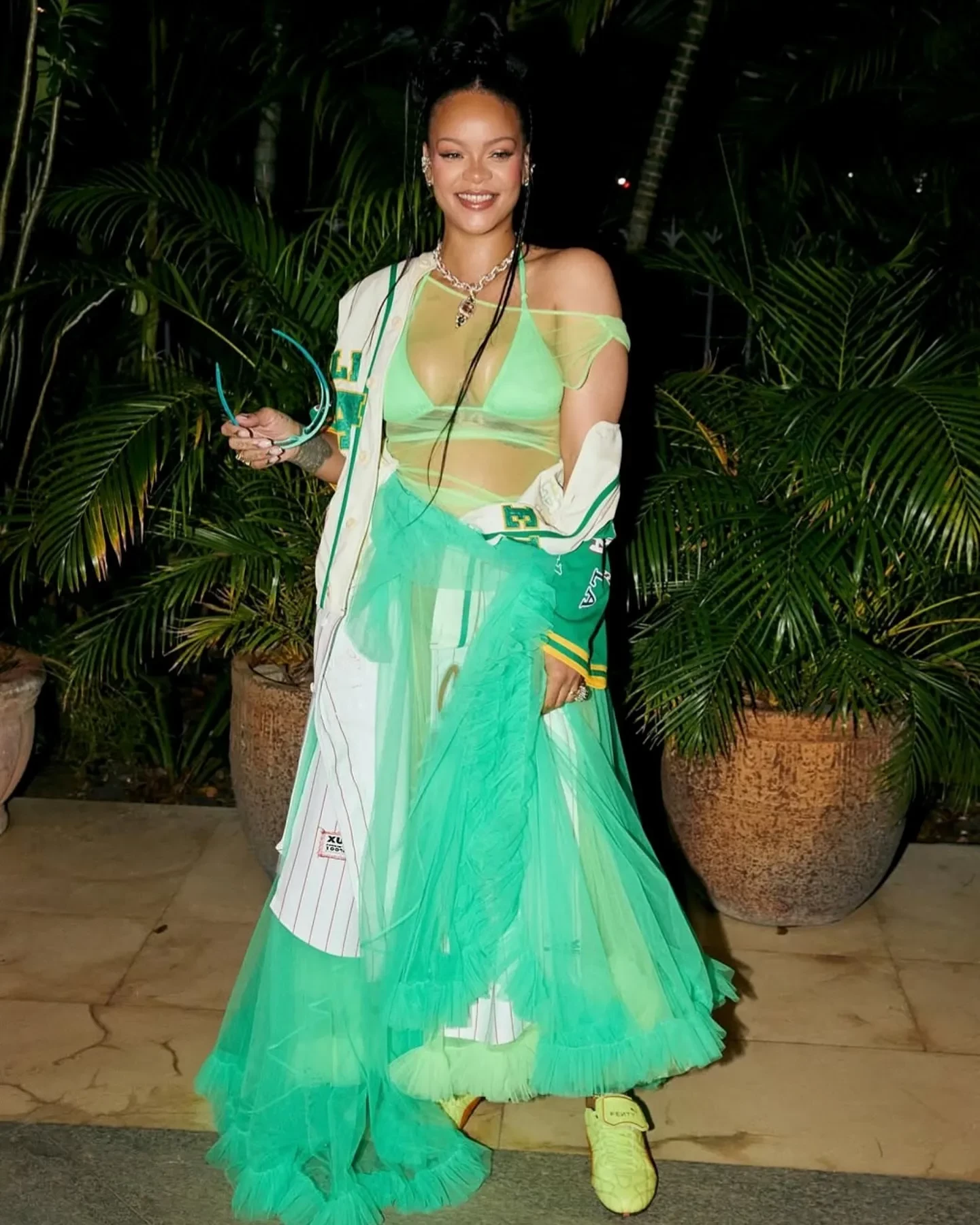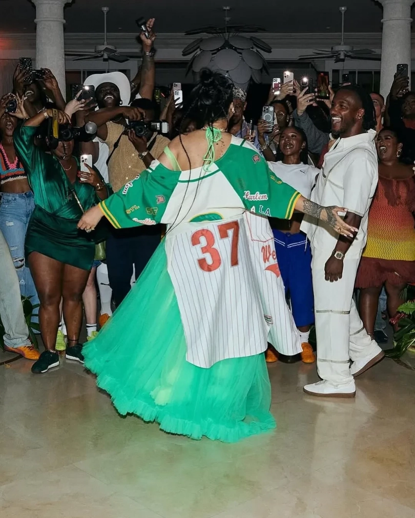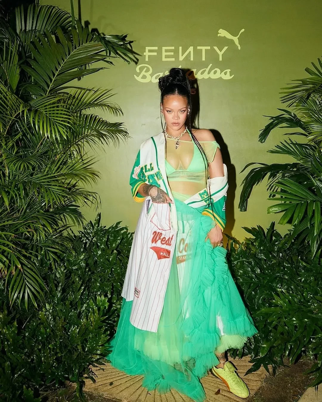 Рианна для мероприятия выбрала зелёное платье-пачку с рюшами, неоновый лиф от купальника и бейсбольный бомбер. Она дополнила образ бриллиантовым колье Sabyasachi, которое ранее надевала актриса Голди Хоун на "Оскаре-2025", и новыми кроссовками Fenty x Puma в тропических оттенках, вдохновлённых Барбадосом. На вечеринке гости танцевали и фотографировались с Рианной.