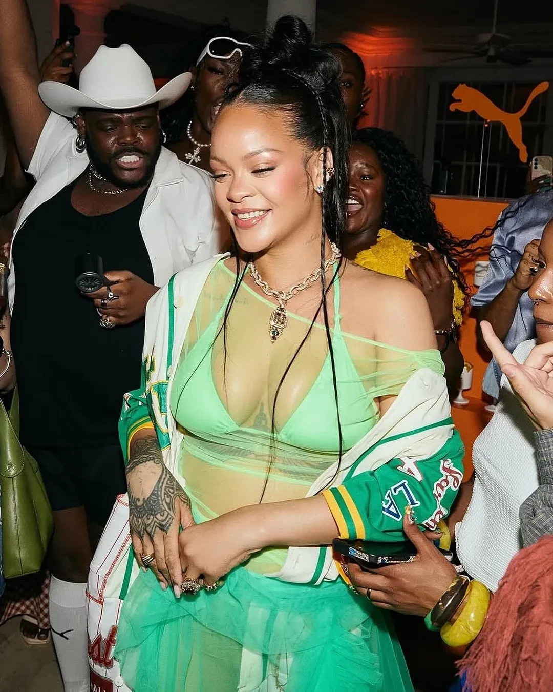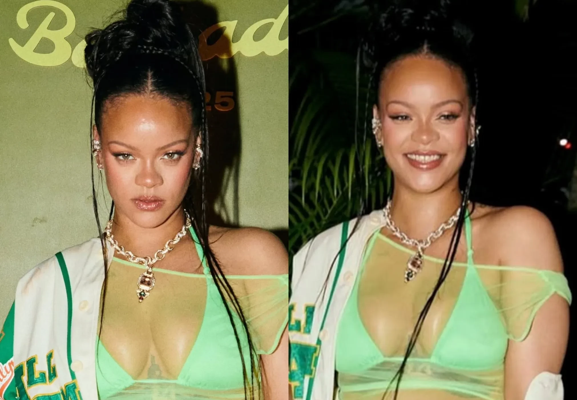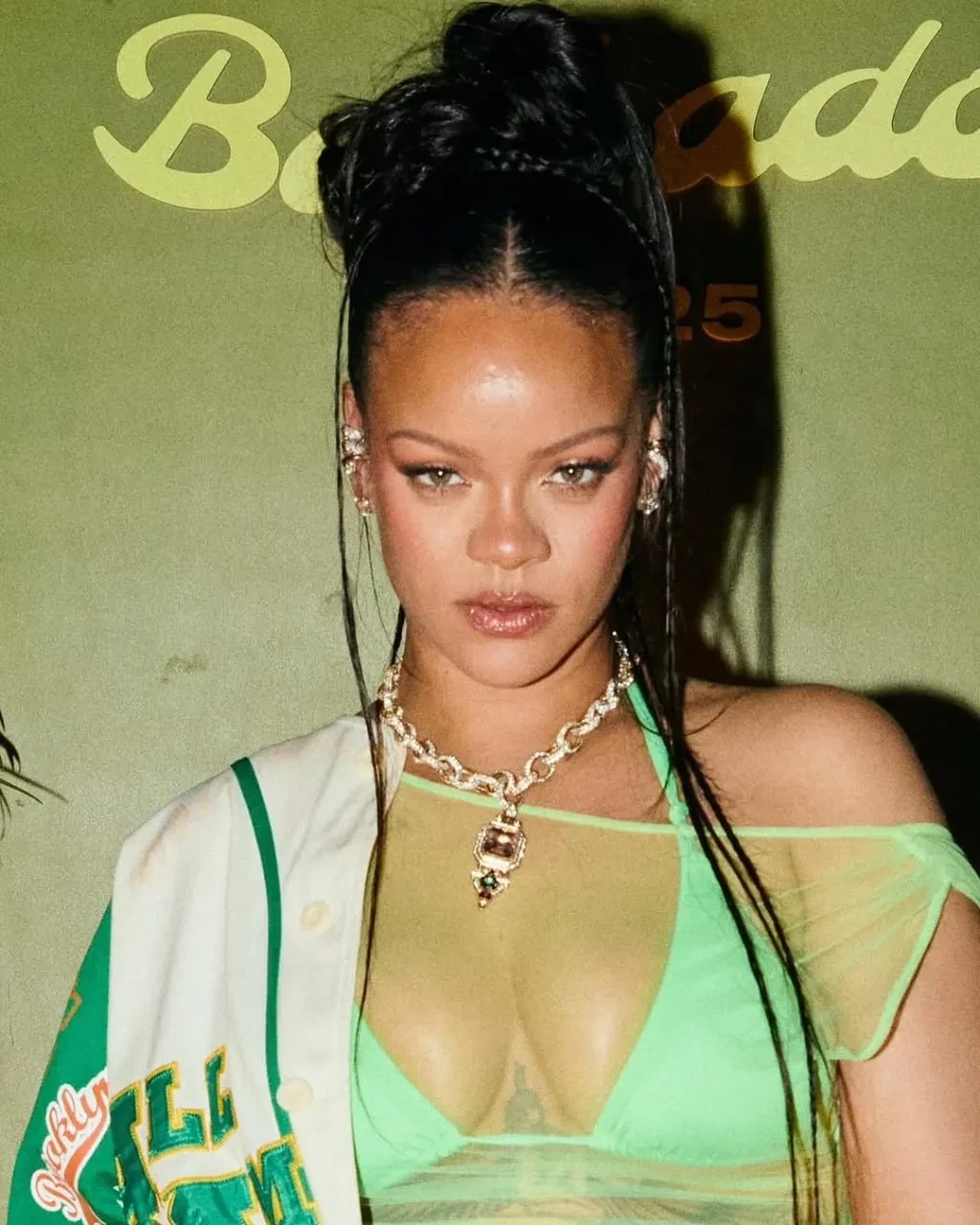 Рианна для мероприятия выбрала зелёное платье-пачку с рюшами, неоновый лиф от купальника и бейсбольный бомбер. Она дополнила образ бриллиантовым колье Sabyasachi, которое ранее надевала актриса Голди Хоун на "Оскаре-2025", и новыми кроссовками Fenty x Puma в тропических оттенках, вдохновлённых Барбадосом. На вечеринке гости танцевали и фотографировались с Рианной.