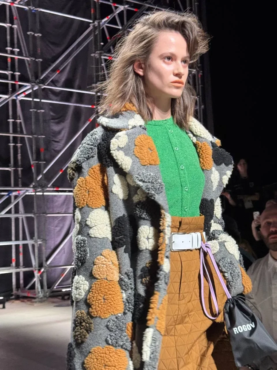 Ольга Шуранова и Александр Рогов/Фото: olga_shuranova/TelegramНа показе Александра Рогова модели носили всё, что будет актуально этой осенью: шубы с цветочным декором и пальто с меховыми воротниками, стёганые юбки, объёмные и приталенные кардиганы, цветные колготки, огромные сумки, серые гольфы, леопард и бархат. Макияж моделей с помадой в тон кожи напоминал о 2010-х, а "отсутствие" укладки — о недавних шоу Prada и Miu Miu.