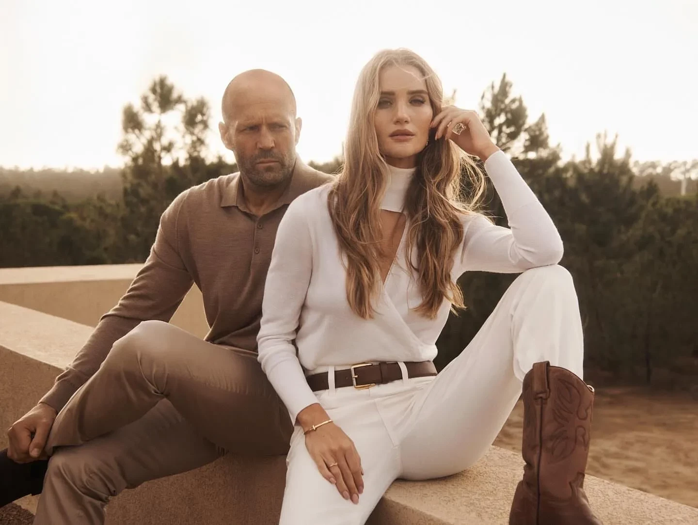 37-летняя модель примерила сразу несколько образов: тонкое белое платье с V-образным вырезом и разрезами на рукавах, которое она дополнила массивными коричневыми ботинками. Затем Рози переоделась в белую водолазку с длинными рукавами и белыми брюками. Она также примерила коричневый топ с V-образным вырезом. 57-летний актёр позировал в бежевом лонгсливе с брюками.