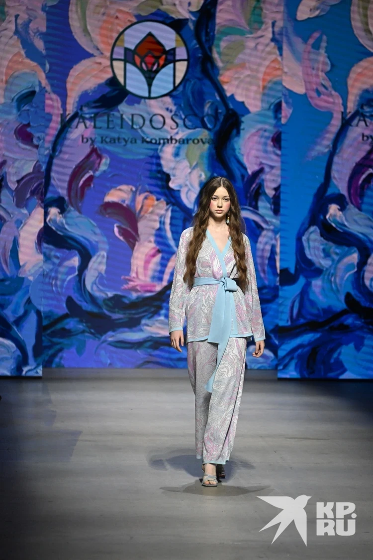 Красочную коллекцию представила дизайнер Екатерина Комбарова (бренд Maison Kaleidoscope by Katya Kombarova). В линейку вошли яркие трикотажные шелковые костюмы, а также кардиганы и топы, украшенные перьями. Все эти комплекты смело можно носить в конце весны и летом.