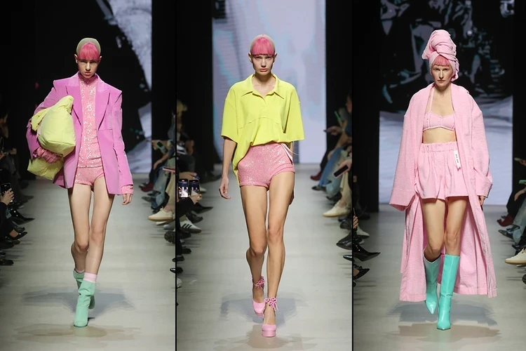 Хочется отметить конфетно-карамельную цветовую гамму на показе московского бренда Bitte_Ruhe. Пастельно-розовый, светло-желтый, мятный, оранжевый — все эти оттенки легко интегрировать в весенний и летний гардеробы. Модели с искусственными розовыми челками демонстрировали образы в разных стилях: кокетливые платья и комлекты в духе baby doll, миниюбки и микрошорты в сочетании с объемными жакетами, а также спортивные костюмы.