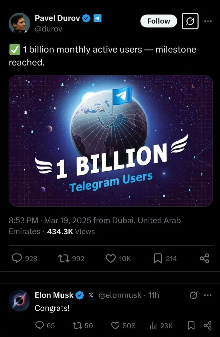 Павел Дуров, на которого завели уголовное дело во Франции из-за отказа Telegram сотрудничать с властями, сообщил, что количество пользователей его мессенджера достигло 1 млрд. Он также раскритиковал WhatsApp и получил комплимент от Илона Маска.