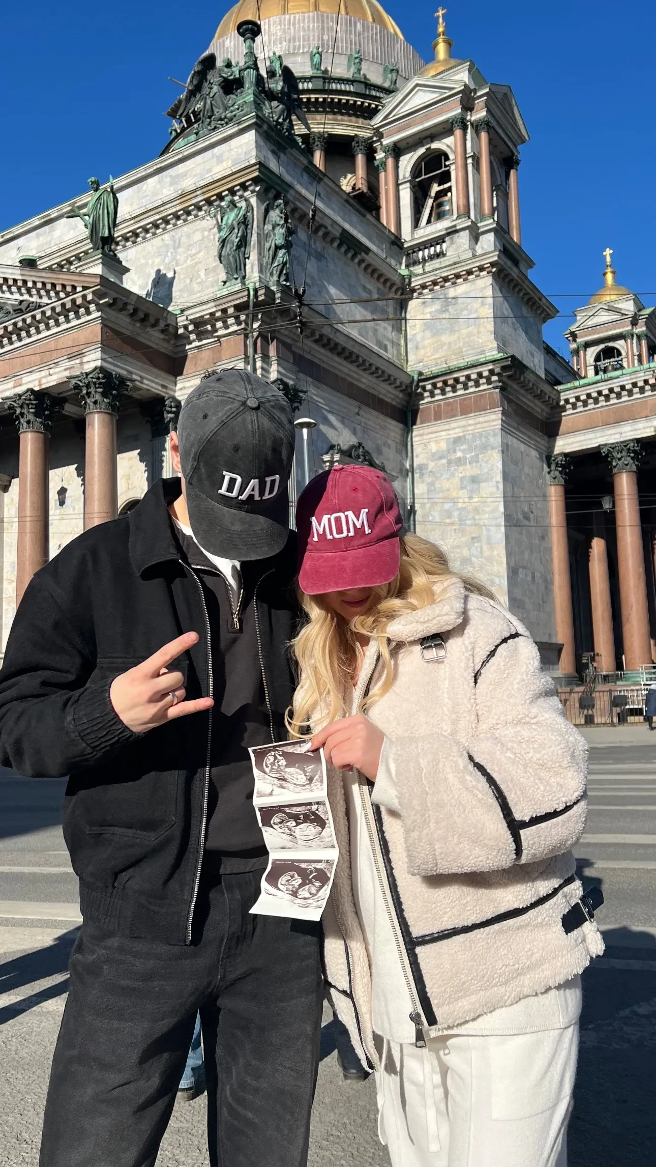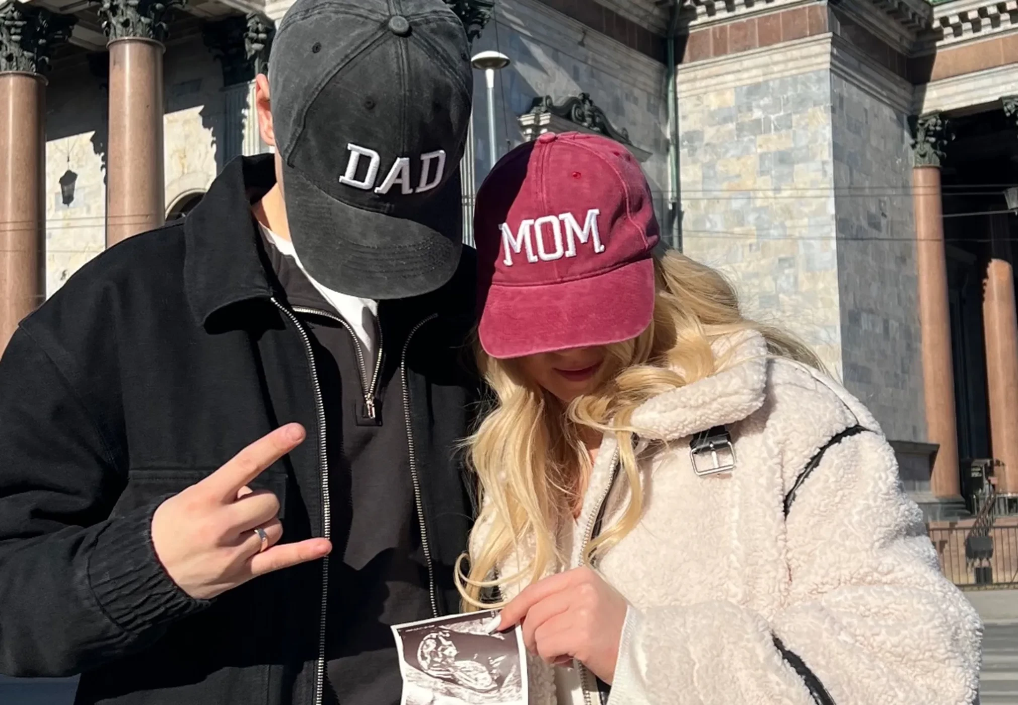 В кадре 20-летняя Александра и 24-летний Макар предстали в кепках с надписями Mom и Dad ("Мама" и "Папа"), фигуристка показала снимки ребёнка, полученные на УЗИ.