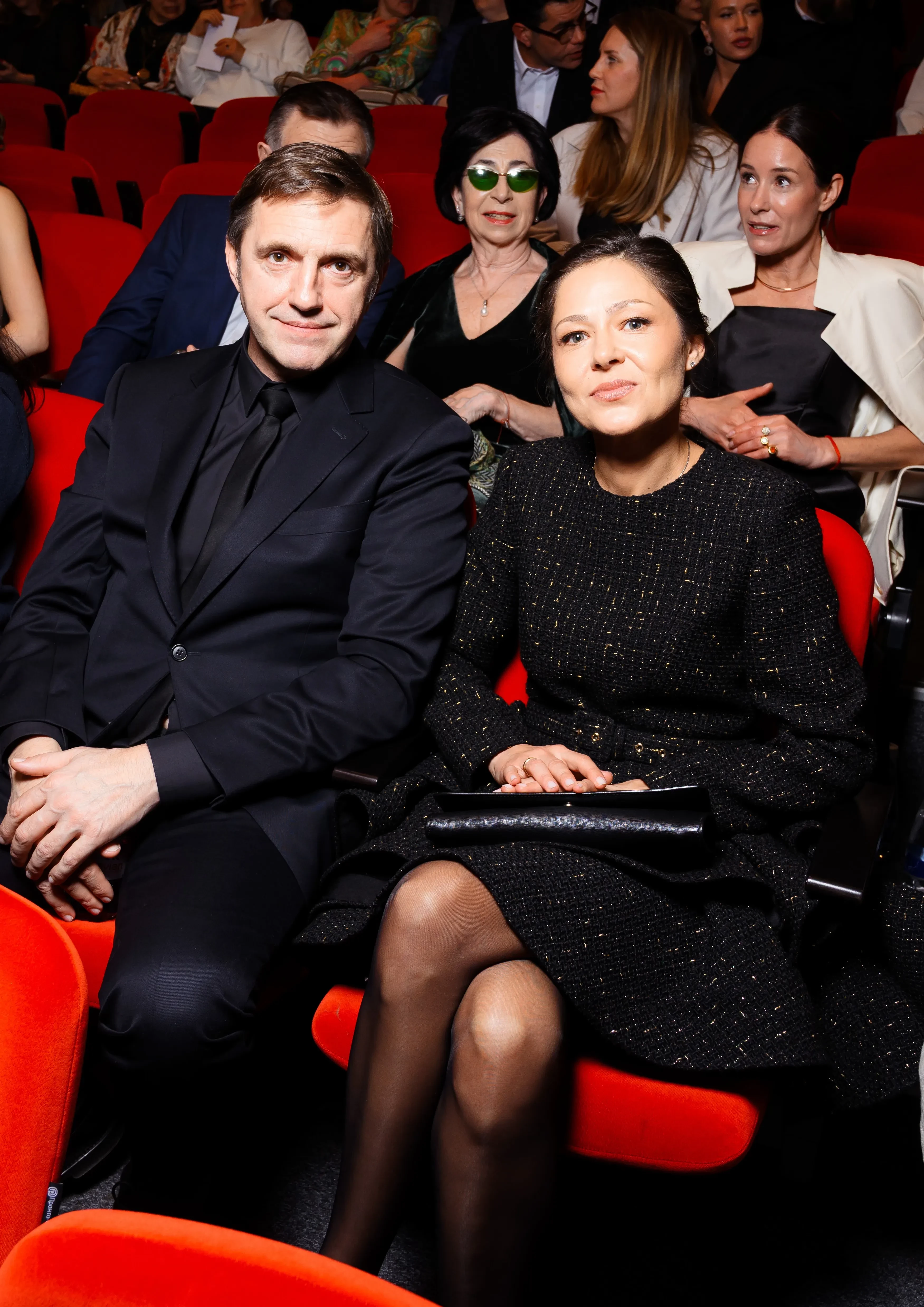 На дорожке Елена позировала в чёрном твидовом платье с расклёшенной юбкой, а Владимир надел образ total black и обнимал супругу перед фотографами.
