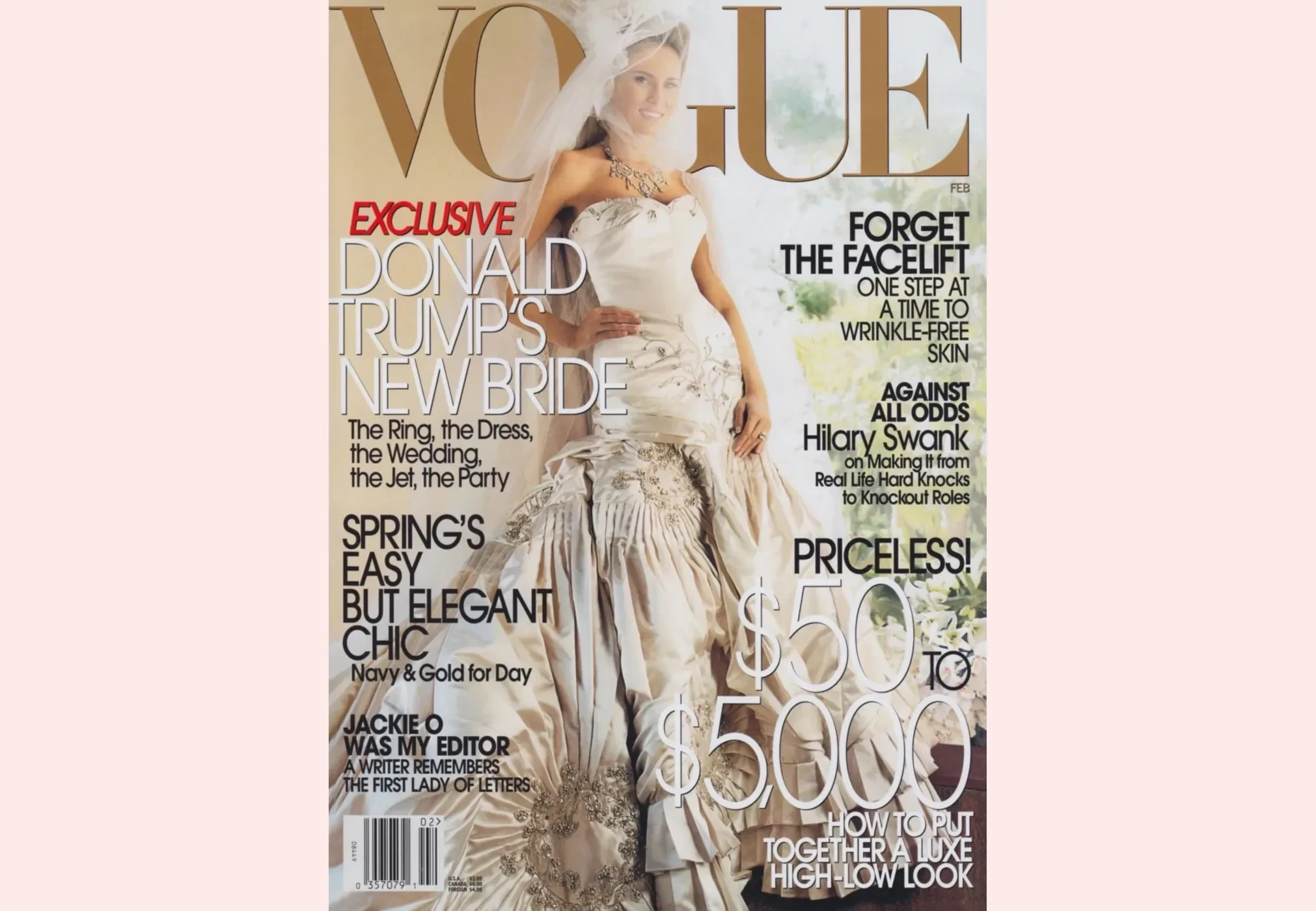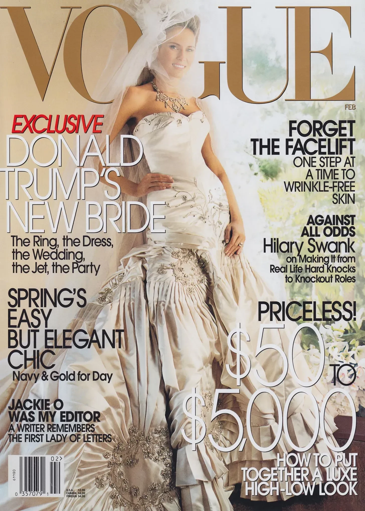 Мелания Трамп в 2005 году для VogueК слову, в январе этого года, в честь 20-й годовщины их свадьбы, Трамп опубликовал в инстаграме* архивное фото с торжества, на котором Мелания запечатлена именно в этом платье.