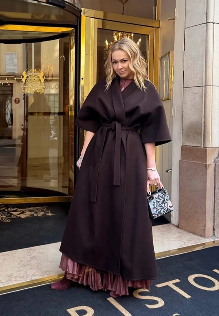 Как носить коричневый цвет: Рудковская сочетает шоколадное кимоно с бордовым нарядом, а Бородина выбирает кожаное платье светло-коричневого оттенка