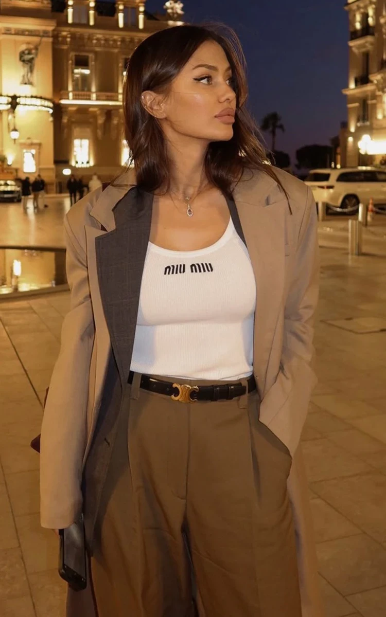 Виктория показывает, как носить сразу два жакета — бежевый и коричневый. Их она сочетает в майкой Miu Miu и широкими светло-коричневыми брюками, которые дополняет ремнем Celine. Предположу, что на плече у блогера висит трендовая замшевая сумка. В целом, все уместно. И главное — образ идет Боне. Единственное, я бы ограничилась одним жакетом, коричневым.